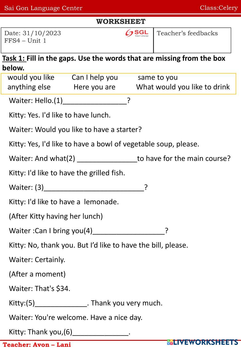Created byNguyễn Thị ThanhThao english homework Age 10-17 level: ffs4 Vietnamese Author's Instructions homework My Google Classroom Courses × 0 classes selected (0 students total) Quick Access Select all classes (0 classes) All Classes Loading courses... Cancel Share Share to selected Course __COURSE_NAME__ __STUDENT_NAME__ (__STUDENT_EMAIL__) homework Download Worksheet Validation Check my answers Emails my answers to my teacher Full name Group/level School subject Teacher's email or key code Close Submit Validating worksheet... (12) Your answers have been sent to your teacher. Good luck! OK We encountered an error submitting your answers. Please try again. OK Advertisement | Go Ad Free Created byNguyễn Thị ThanhThao english homework Age 10-17 level: ffs4 Vietnamese Author's Instructions homework