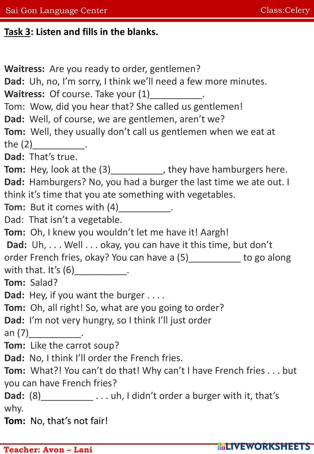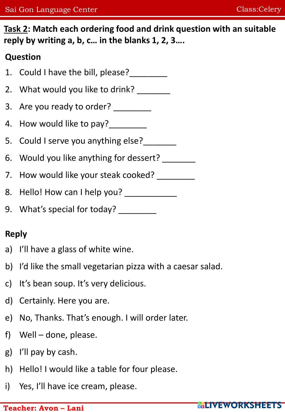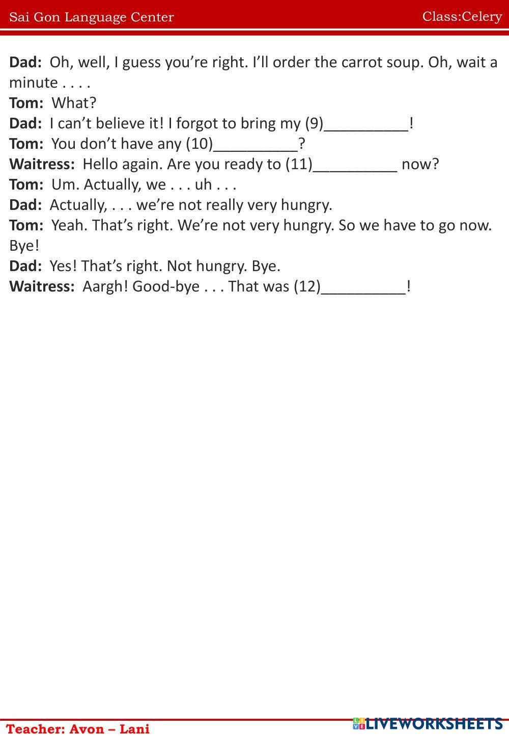 Created byNguyễn Thị ThanhThao english homework Age 10-14 level: ffs4 unit1 Vietnamese Author's Instructions homework My Google Classroom Courses × 0 classes selected (0 students total) Quick Access Select all classes (0 classes) All Classes Loading courses... Cancel Share Share to selected Course __COURSE_NAME__ __STUDENT_NAME__ (__STUDENT_EMAIL__) homework Download Worksheet Validation Check my answers Emails my answers to my teacher Full name Group/level School subject Teacher's email or key code Close Submit Validating worksheet... (12) Your answers have been sent to your teacher. Good luck! OK We encountered an error submitting your answers. Please try again. OK Advertisement | Go Ad Free Created byNguyễn Thị ThanhThao english homework Age 10-14 level: ffs4 unit1 Vietnamese Author's Instructions homework