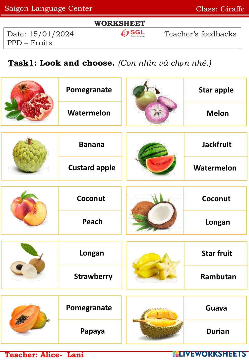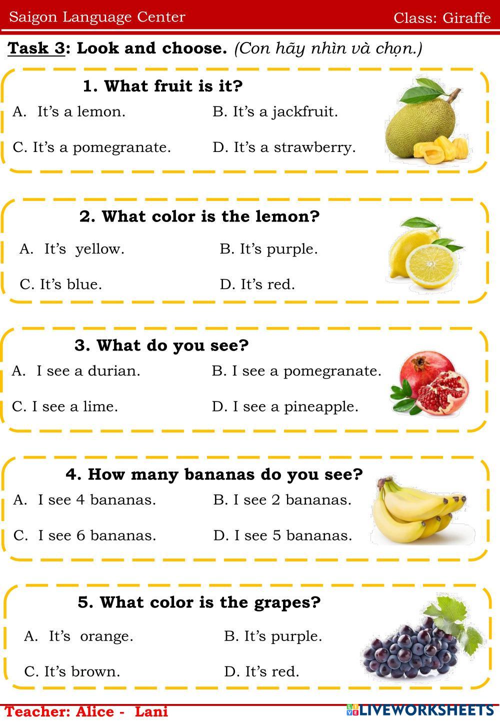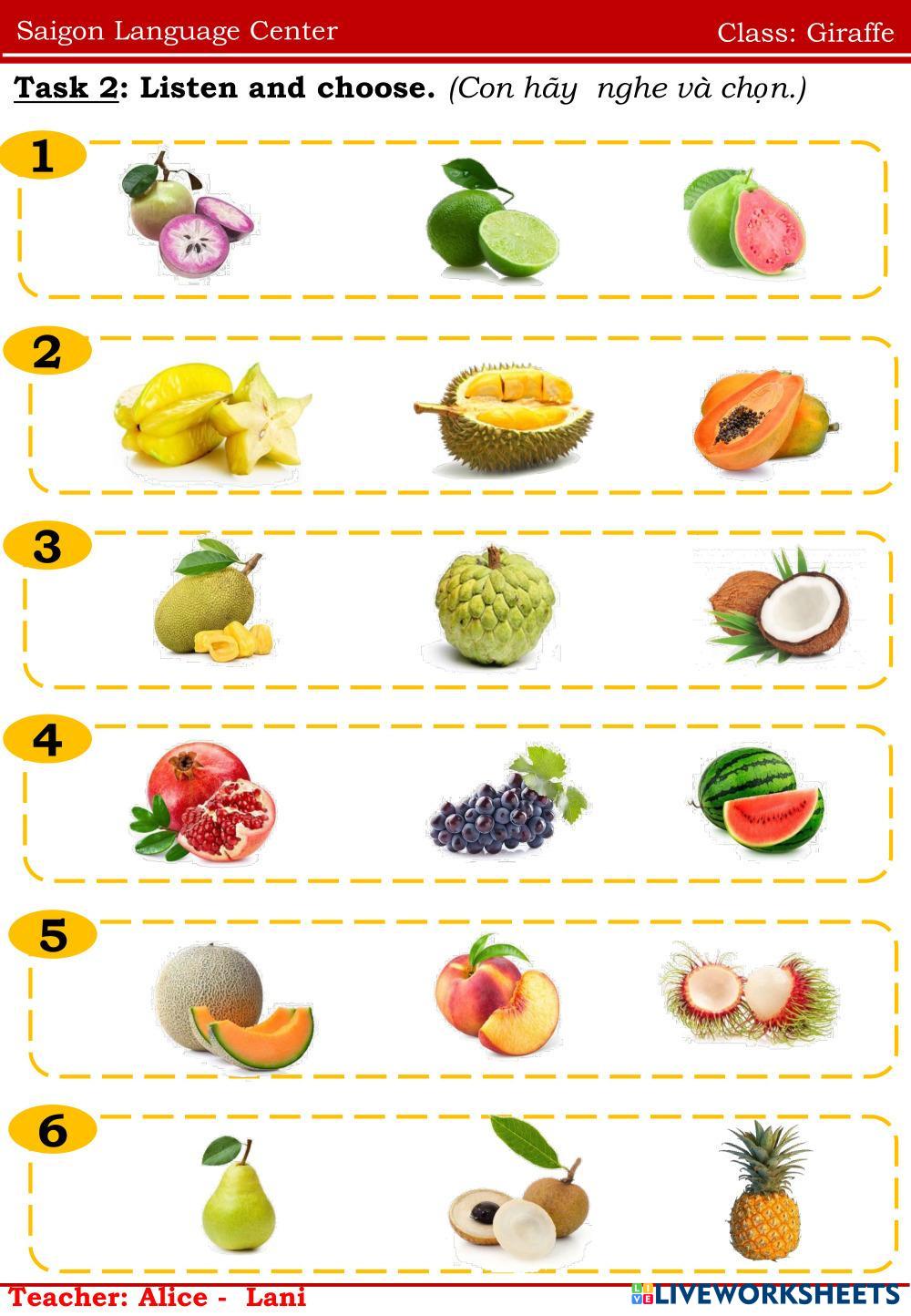 Created byNguyễn Thị ThanhThao english fruits Age 6-10 level: ppd Vietnamese Author's Instructions english My Google Classroom Courses × 0 classes selected (0 students total) Quick Access Select all classes (0 classes) All Classes Loading courses... Cancel Share Share to selected Course __COURSE_NAME__ __STUDENT_NAME__ (__STUDENT_EMAIL__) Giraffe Download Worksheet Validation Check my answers Emails my answers to my teacher Full name Group/level School subject Teacher's email or key code Close Submit Validating worksheet... (12) Your answers have been sent to your teacher. Good luck! OK We encountered an error submitting your answers. Please try again. OK Advertisement | Go Ad Free Created byNguyễn Thị ThanhThao english fruits Age 6-10 level: ppd Vietnamese Author's Instructions english