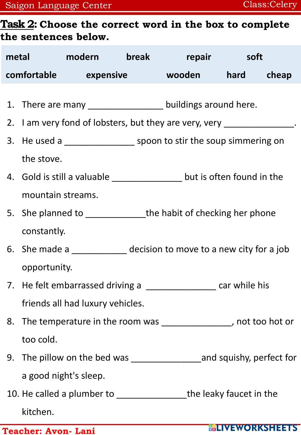 Created byNguyễn Thị ThanhThao english noname Age 11-15 level: ffs4 Vietnamese Author's Instructions english My Google Classroom Courses × 0 classes selected (0 students total) Quick Access Select all classes (0 classes) All Classes Loading courses... Cancel Share Share to selected Course __COURSE_NAME__ __STUDENT_NAME__ (__STUDENT_EMAIL__) celery Download Worksheet Validation Check my answers Emails my answers to my teacher Full name Group/level School subject Teacher's email or key code Close Submit Validating worksheet... (12) Your answers have been sent to your teacher. Good luck! OK We encountered an error submitting your answers. Please try again. OK Advertisement | Go Ad Free Created byNguyễn Thị ThanhThao english noname Age 11-15 level: ffs4 Vietnamese Author's Instructions english