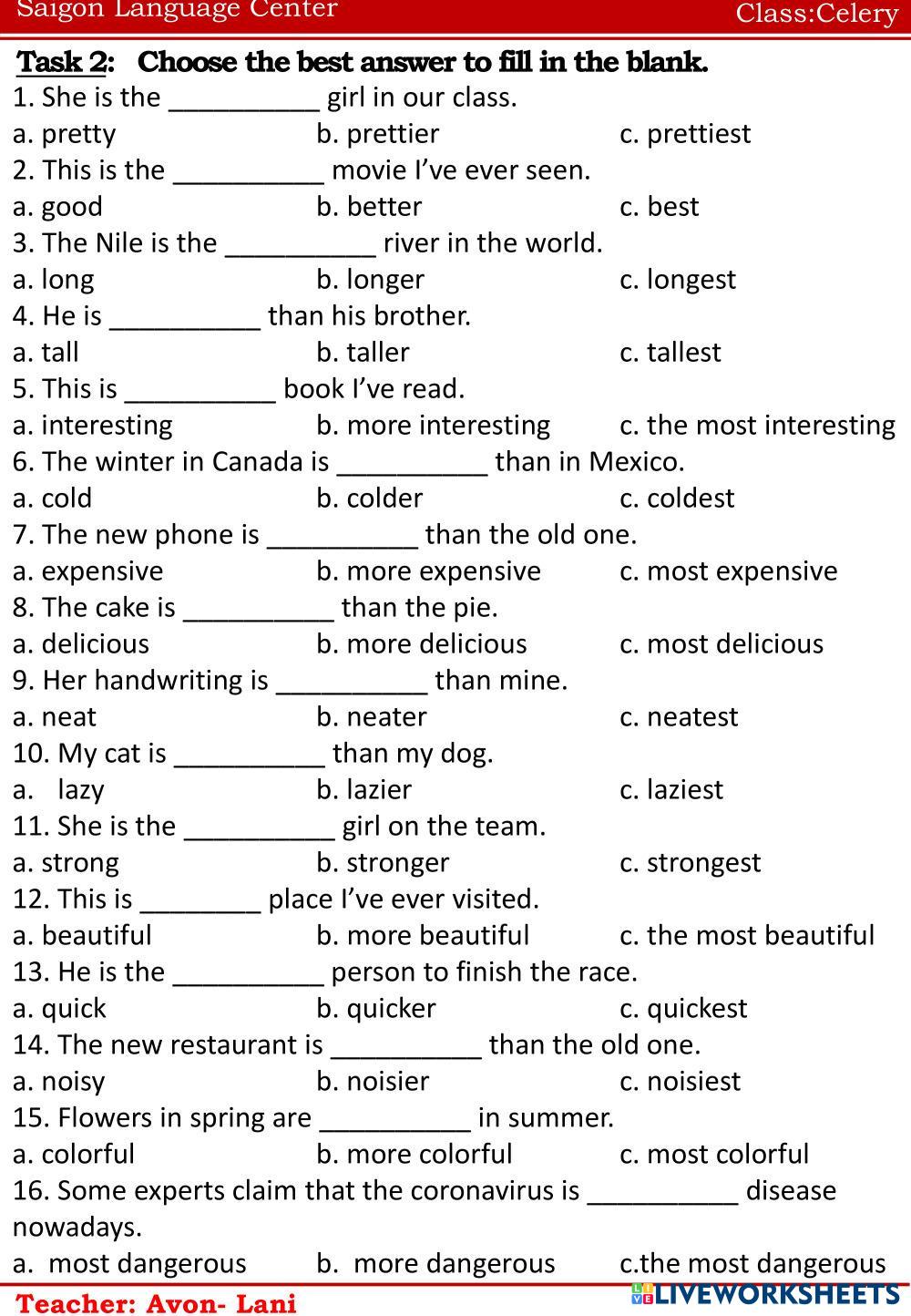 Created byNguyễn Thị ThanhThao english english Age 10-15 level: ffs4 Vietnamese Author's Instructions è My Google Classroom Courses × 0 classes selected (0 students total) Quick Access Select all classes (0 classes) All Classes Loading courses... Cancel Share Share to selected Course __COURSE_NAME__ __STUDENT_NAME__ (__STUDENT_EMAIL__) CELERY Download Worksheet Validation Check my answers Emails my answers to my teacher Full name Group/level School subject Teacher's email or key code Close Submit Validating worksheet... (12) Your answers have been sent to your teacher. Good luck! OK We encountered an error submitting your answers. Please try again. OK Advertisement | Go Ad Free Created byNguyễn Thị ThanhThao english english Age 10-15 level: ffs4 Vietnamese Author's Instructions è