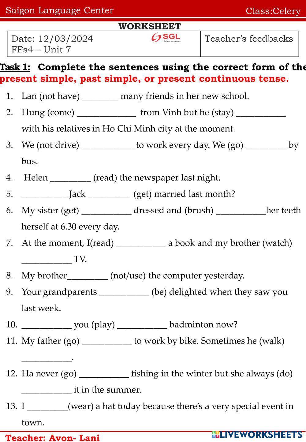 Created byNguyễn Thị ThanhThao english cdwdx Age 11-15 level: ffs4 Vietnamese Author's Instructions v My Google Classroom Courses × 0 classes selected (0 students total) Quick Access Select all classes (0 classes) All Classes Loading courses... Cancel Share Share to selected Course __COURSE_NAME__ __STUDENT_NAME__ (__STUDENT_EMAIL__) CELERY Download Worksheet Validation Check my answers Emails my answers to my teacher Full name Group/level School subject Teacher's email or key code Close Submit Validating worksheet... (12) Your answers have been sent to your teacher. Good luck! OK We encountered an error submitting your answers. Please try again. OK Advertisement | Go Ad Free Created byNguyễn Thị ThanhThao english cdwdx Age 11-15 level: ffs4 Vietnamese Author's Instructions v