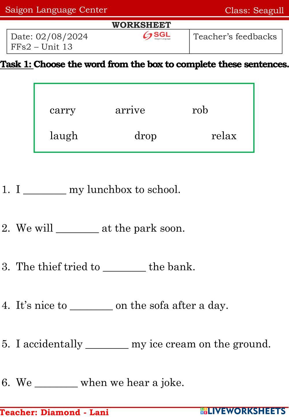 Created byNguyễn Thị ThanhThao english english Age 7-11 level: ffs1 Vietnamese Author's Instructions english My Google Classroom Courses × 0 classes selected (0 students total) Quick Access Select all classes (0 classes) All Classes Loading courses... Cancel Share Share to selected Course __COURSE_NAME__ __STUDENT_NAME__ (__STUDENT_EMAIL__) Seagull Download Worksheet Validation Check my answers Emails my answers to my teacher Full name Group/level School subject Teacher's email or key code Close Submit Validating worksheet... (12) Your answers have been sent to your teacher. Good luck! OK We encountered an error submitting your answers. Please try again. OK Advertisement | Go Ad Free Created byNguyễn Thị ThanhThao english english Age 7-11 level: ffs1 Vietnamese Author's Instructions english