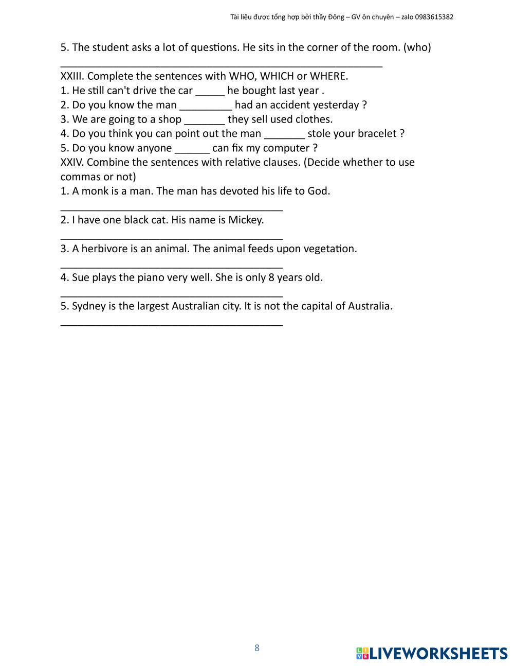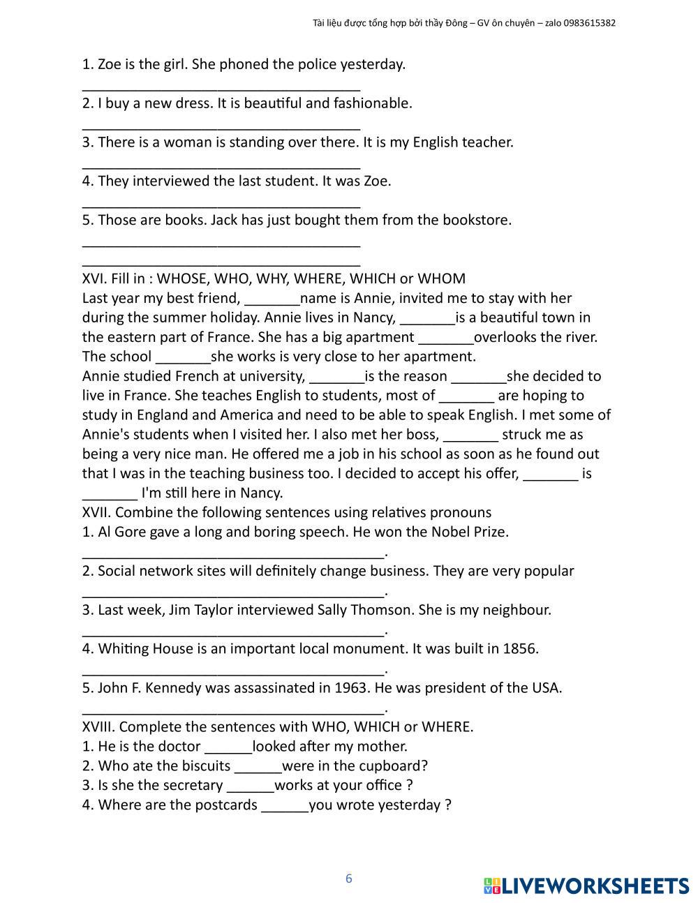 Created byNguyễn Xuân Đông english test Age 12-17 level: 8 Vietnamese Author's Instructions My Google Classroom Courses × 0 classes selected (0 students total) Quick Access Select all classes (0 classes) All Classes Loading courses... Cancel Share Share to selected Course __COURSE_NAME__ __STUDENT_NAME__ (__STUDENT_EMAIL__) Bài tập mệnh đề quan hệ Download Worksheet Validation Check my answers Emails my answers to my teacher Full name Group/level School subject Teacher's email or key code Close Submit Validating worksheet... (12) Your answers have been sent to your teacher. Good luck! OK We encountered an error submitting your answers. Please try again. OK Advertisement | Go Ad Free Created byNguyễn Xuân Đông english test Age 12-17 level: 8 Vietnamese Author's Instructions