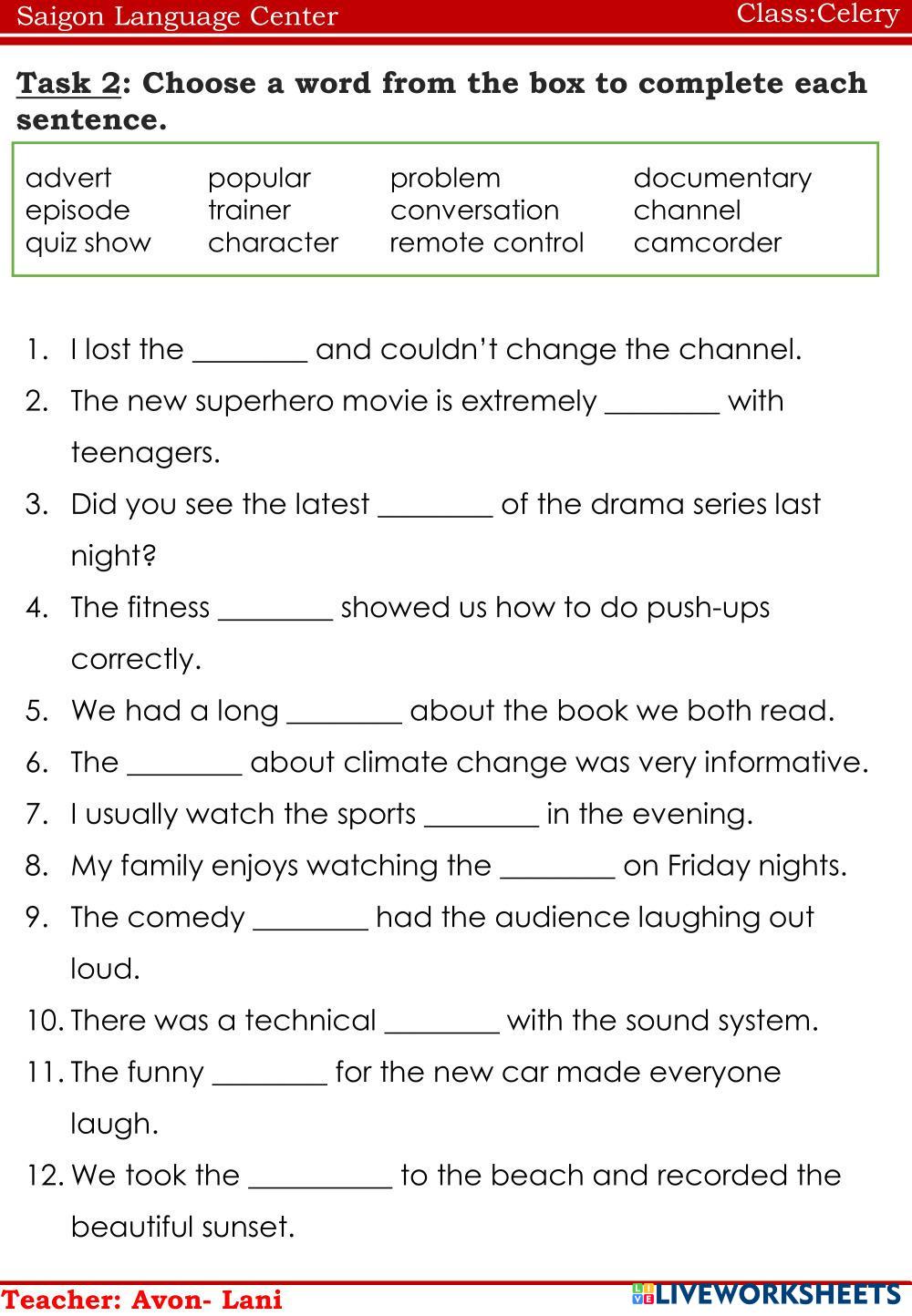 Created byNguyễn Thị ThanhThao english e Age 10-15 level: ffs4 Vietnamese Author's Instructions e My Google Classroom Courses × 0 classes selected (0 students total) Quick Access Select all classes (0 classes) All Classes Loading courses... Cancel Share Share to selected Course __COURSE_NAME__ __STUDENT_NAME__ (__STUDENT_EMAIL__) CELERY Download Worksheet Validation Check my answers Emails my answers to my teacher Full name Group/level School subject Teacher's email or key code Close Submit Validating worksheet... (12) Your answers have been sent to your teacher. Good luck! OK We encountered an error submitting your answers. Please try again. OK Advertisement | Go Ad Free Created byNguyễn Thị ThanhThao english e Age 10-15 level: ffs4 Vietnamese Author's Instructions e