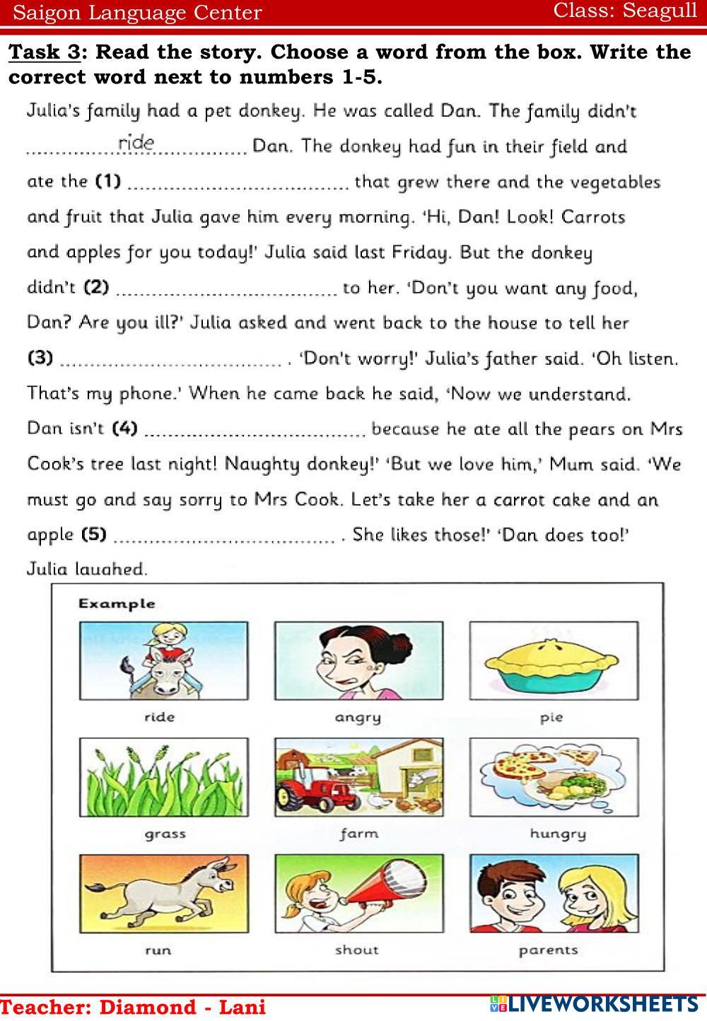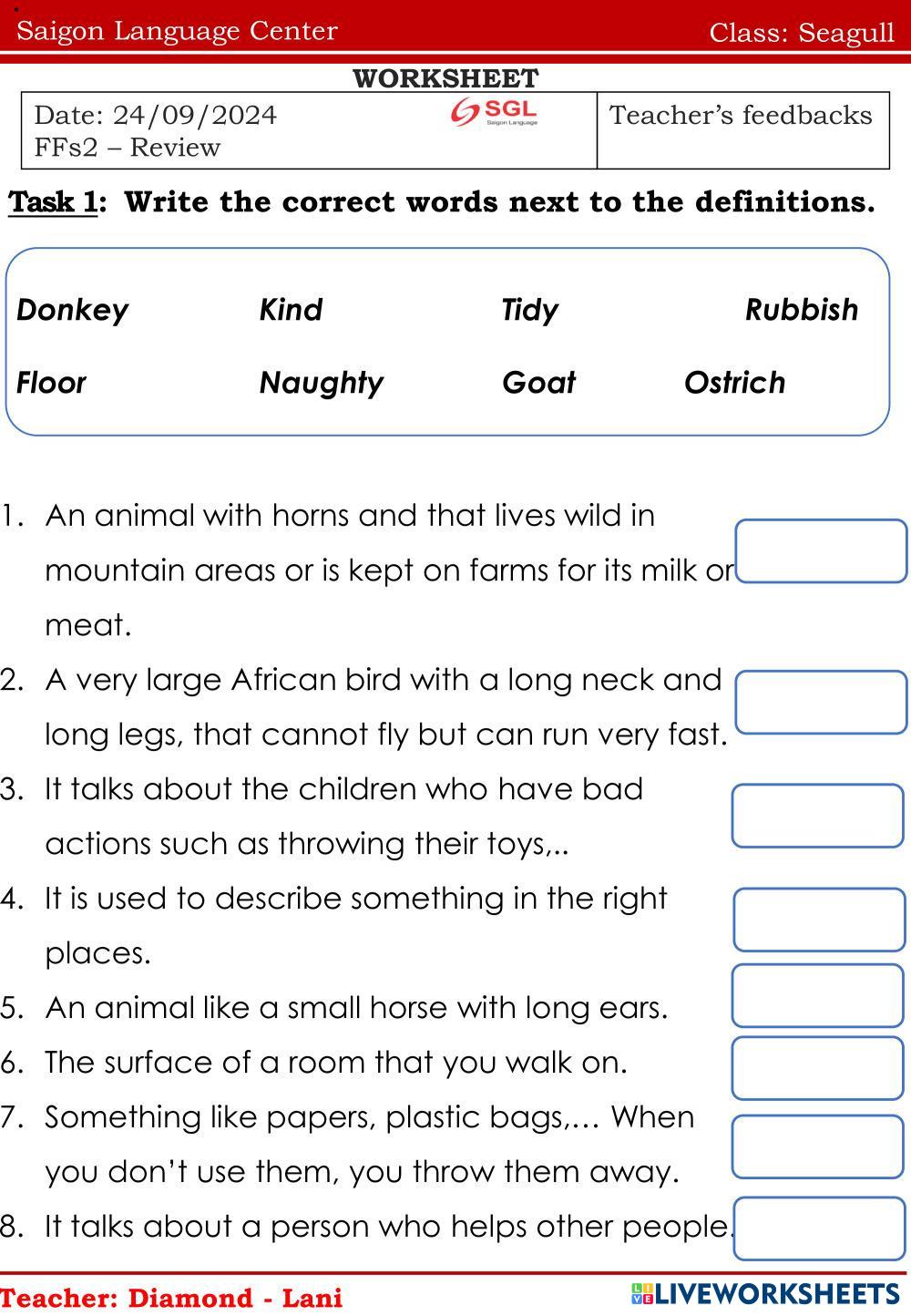 Created byNguyễn Thị ThanhThao english english Age 10-15 level: ffs 2 Vietnamese Author's Instructions 2 My Google Classroom Courses × 0 classes selected (0 students total) Quick Access Select all classes (0 classes) All Classes Loading courses... Cancel Share Share to selected Course __COURSE_NAME__ __STUDENT_NAME__ (__STUDENT_EMAIL__) Seagull Download Worksheet Validation Check my answers Emails my answers to my teacher Full name Group/level School subject Teacher's email or key code Close Submit Validating worksheet... (12) Your answers have been sent to your teacher. Good luck! OK We encountered an error submitting your answers. Please try again. OK Advertisement | Go Ad Free Created byNguyễn Thị ThanhThao english english Age 10-15 level: ffs 2 Vietnamese Author's Instructions 2