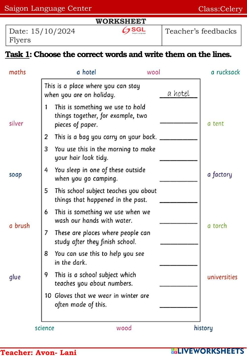 Created byNguyễn Thị ThanhThao english english Age 10-17 level: ffs4 Vietnamese Author's Instructions english My Google Classroom Courses × 0 classes selected (0 students total) Quick Access Select all classes (0 classes) All Classes Loading courses... Cancel Share Share to selected Course __COURSE_NAME__ __STUDENT_NAME__ (__STUDENT_EMAIL__) Celery Download Worksheet Validation Check my answers Emails my answers to my teacher Full name Group/level School subject Teacher's email or key code Close Submit Validating worksheet... (12) Your answers have been sent to your teacher. Good luck! OK We encountered an error submitting your answers. Please try again. OK Advertisement | Go Ad Free Created byNguyễn Thị ThanhThao english english Age 10-17 level: ffs4 Vietnamese Author's Instructions english