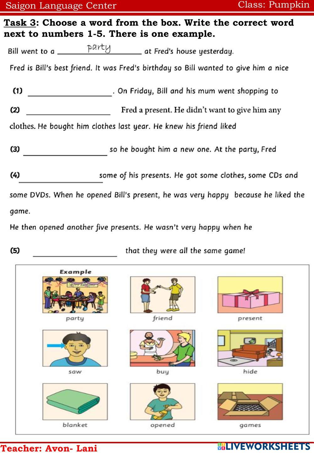 Created byNguyễn Thị ThanhThao english engl Age 13-17 level: ffs2 Vietnamese Author's Instructions e My Google Classroom Courses × 0 classes selected (0 students total) Quick Access Select all classes (0 classes) All Classes Loading courses... Cancel Share Share to selected Course __COURSE_NAME__ __STUDENT_NAME__ (__STUDENT_EMAIL__) Pumpkin Download Worksheet Validation Check my answers Emails my answers to my teacher Full name Group/level School subject Teacher's email or key code Close Submit Validating worksheet... (12) Your answers have been sent to your teacher. Good luck! OK We encountered an error submitting your answers. Please try again. OK Advertisement | Go Ad Free Created byNguyễn Thị ThanhThao english engl Age 13-17 level: ffs2 Vietnamese Author's Instructions e
