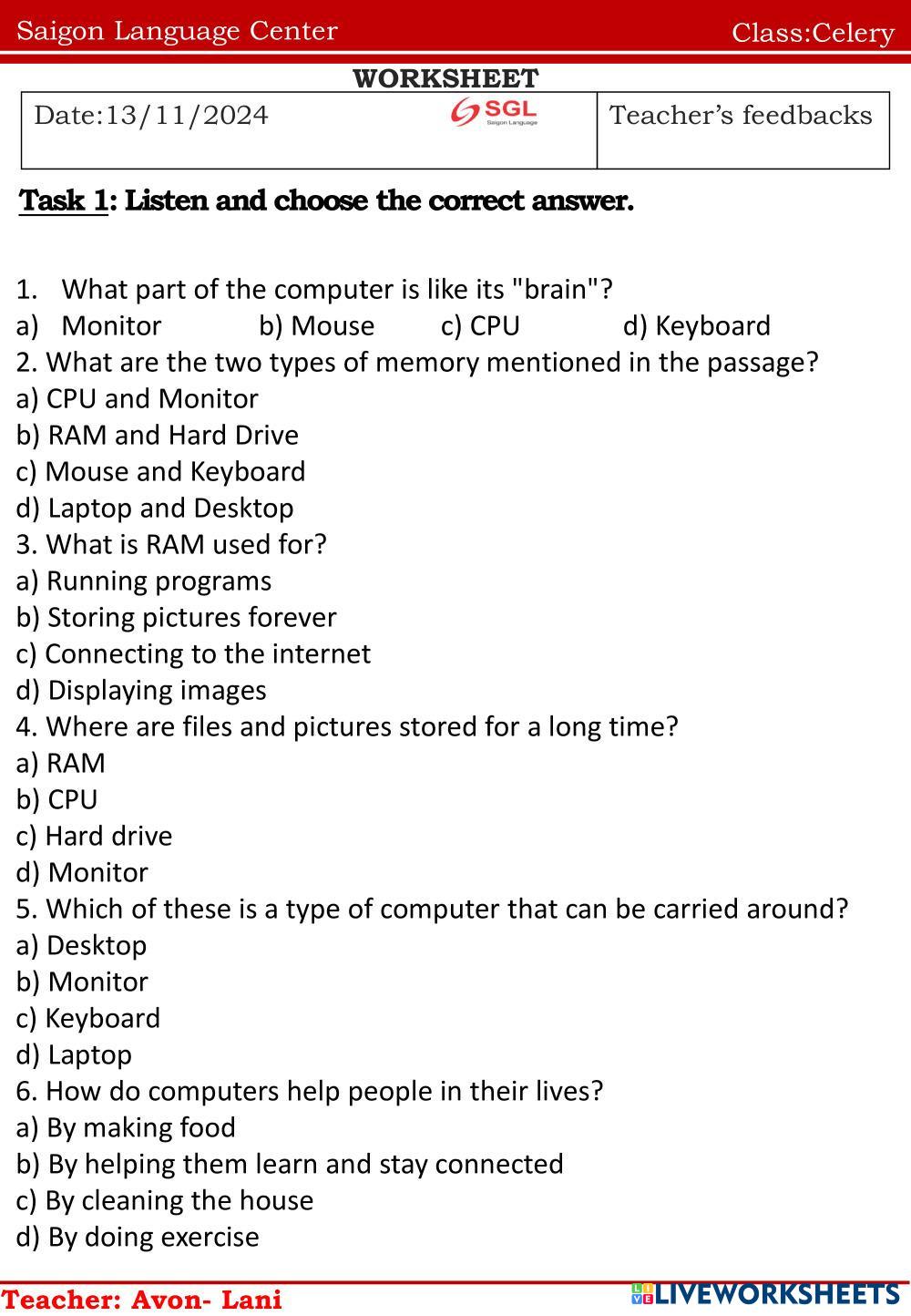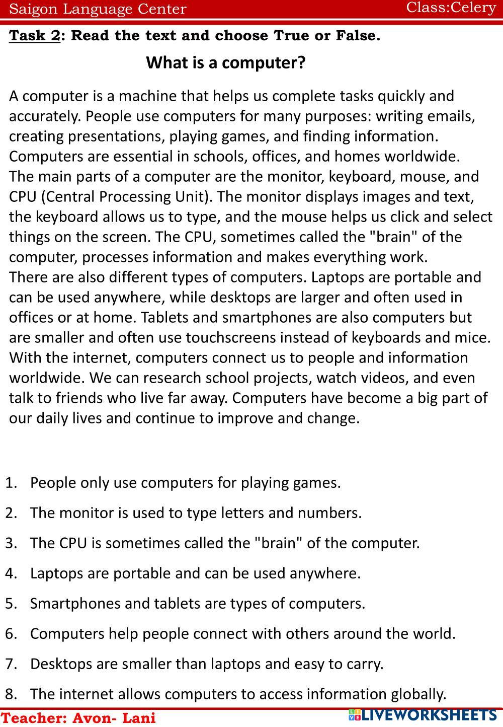 Created byNguyễn Thị ThanhThao english english Age 10-16 level: english Vietnamese Author's Instructions e My Google Classroom Courses × 0 classes selected (0 students total) Quick Access Select all classes (0 classes) All Classes Loading courses... Cancel Share Share to selected Course __COURSE_NAME__ __STUDENT_NAME__ (__STUDENT_EMAIL__) Celery Download Worksheet Validation Check my answers Emails my answers to my teacher Full name Group/level School subject Teacher's email or key code Close Submit Validating worksheet... (12) Your answers have been sent to your teacher. Good luck! OK We encountered an error submitting your answers. Please try again. OK Advertisement | Go Ad Free Created byNguyễn Thị ThanhThao english english Age 10-16 level: english Vietnamese Author's Instructions e