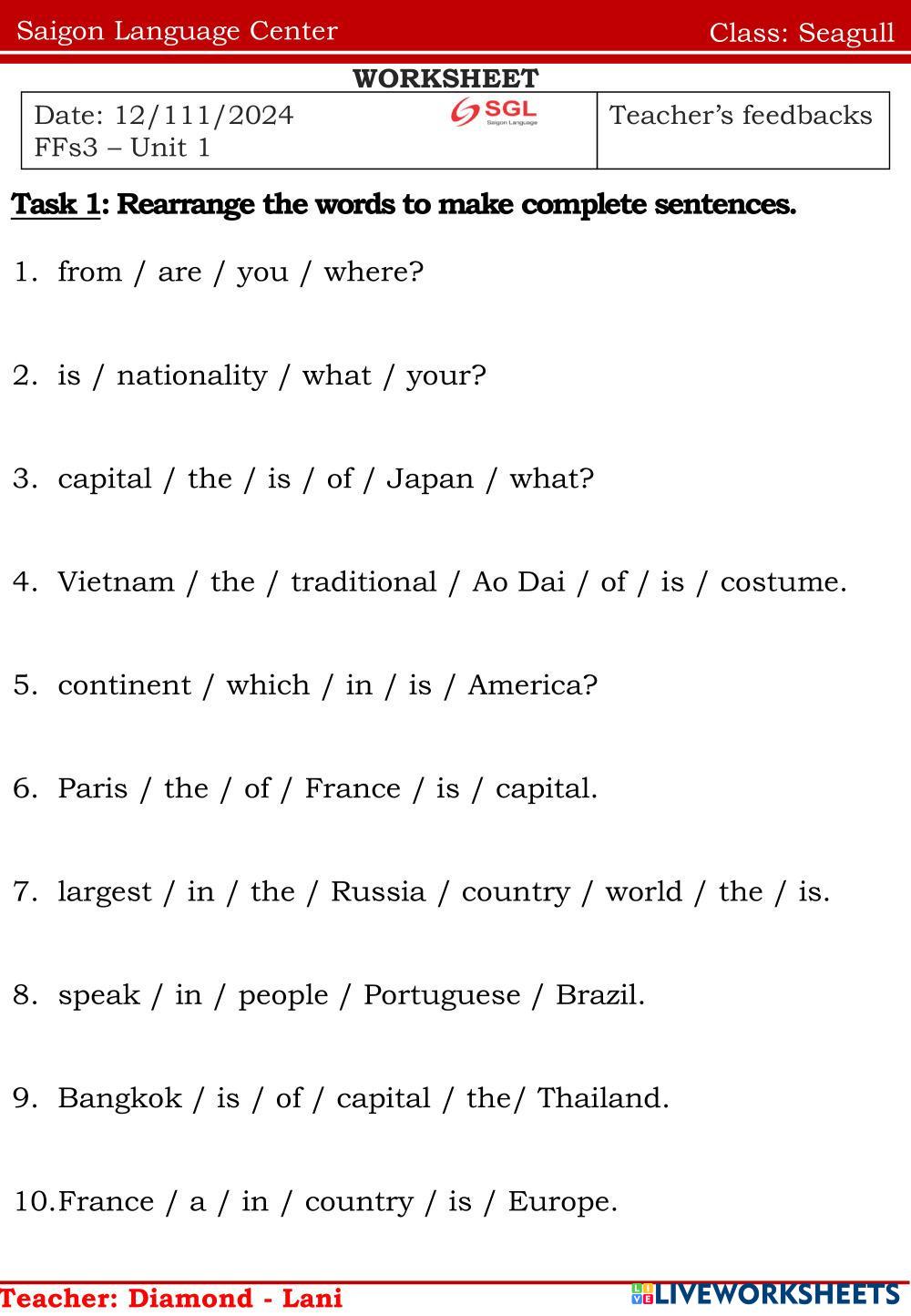 Created byNguyễn Thị ThanhThao english english Age 10-15 level: english Vietnamese Author's Instructions english My Google Classroom Courses × 0 classes selected (0 students total) Quick Access Select all classes (0 classes) All Classes Loading courses... Cancel Share Share to selected Course __COURSE_NAME__ __STUDENT_NAME__ (__STUDENT_EMAIL__) Seagull 12/11/2024 Download Worksheet Validation Check my answers Emails my answers to my teacher Full name Group/level School subject Teacher's email or key code Close Submit Validating worksheet... (12) Your answers have been sent to your teacher. Good luck! OK We encountered an error submitting your answers. Please try again. OK Advertisement | Go Ad Free Created byNguyễn Thị ThanhThao english english Age 10-15 level: english Vietnamese Author's Instructions english