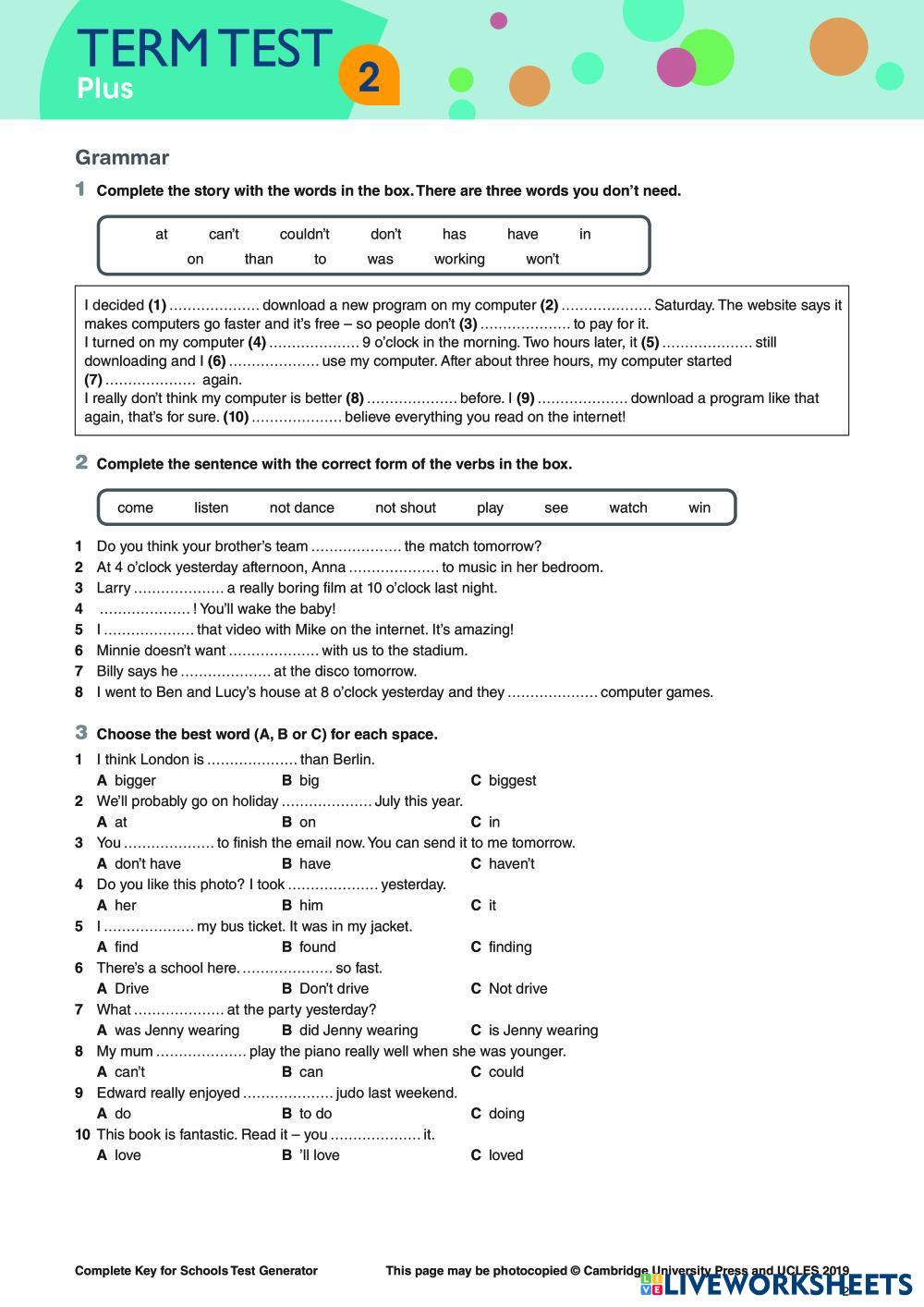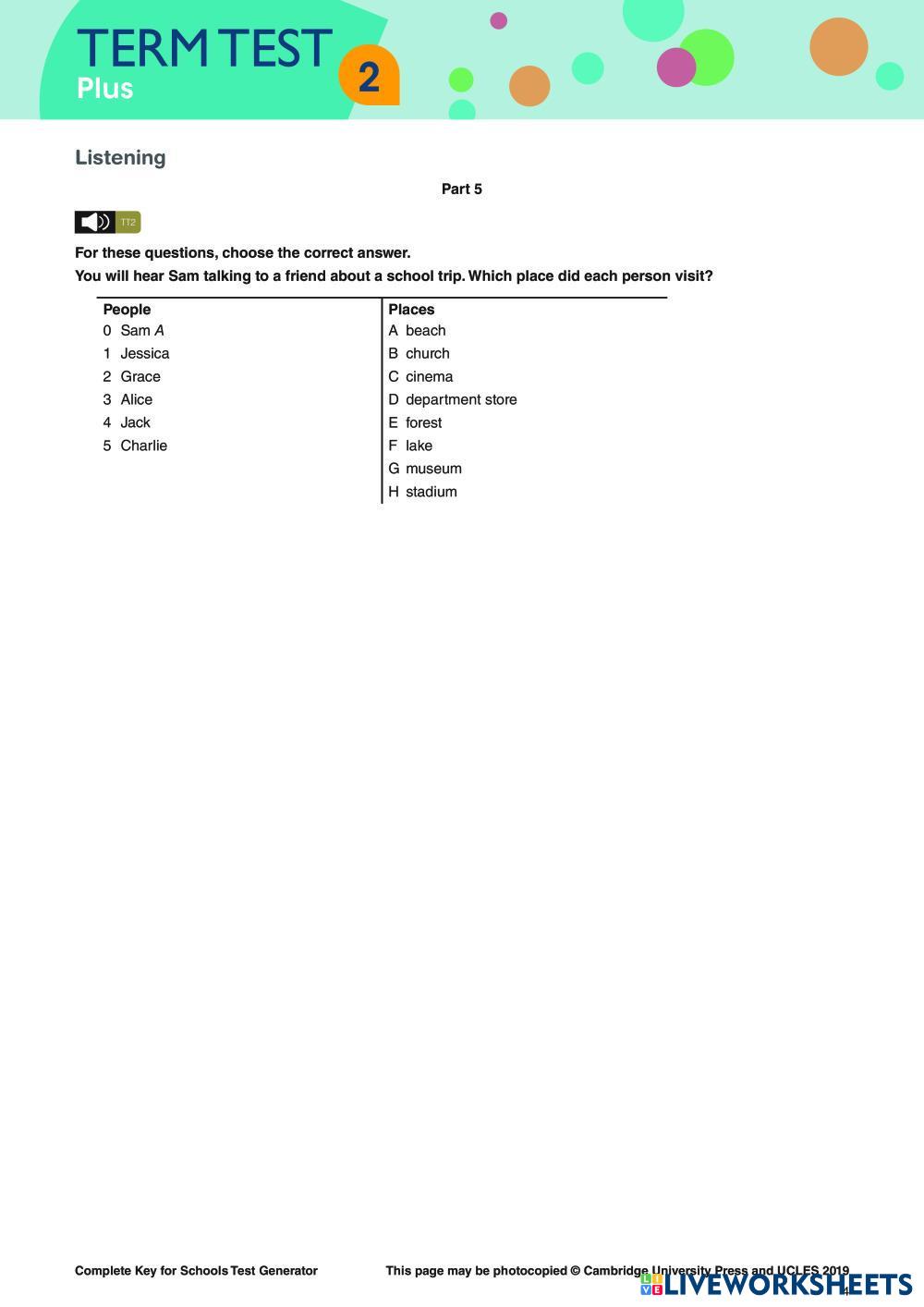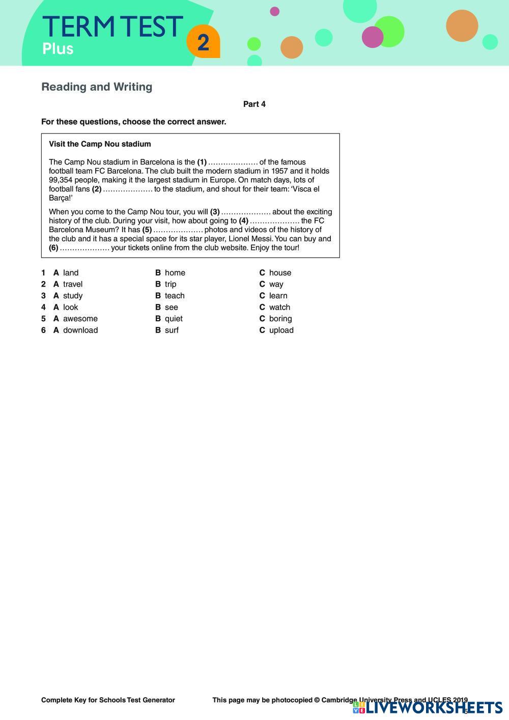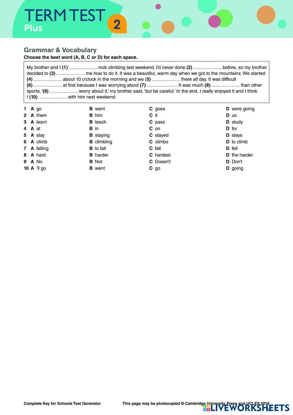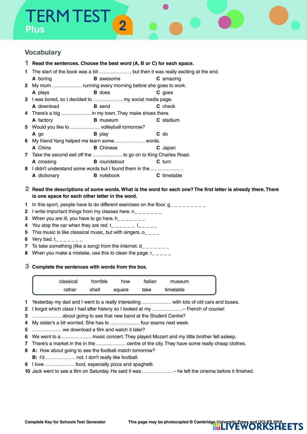 Created byAnna Kate English Term Test 2 Age 9-15 level: KET Vietnamese Author's Instructions My Google Classroom Courses × 0 classes selected (0 students total) Quick Access Select all classes (0 classes) All Classes Loading courses... Cancel Share Share to selected Course __COURSE_NAME__ __STUDENT_NAME__ (__STUDENT_EMAIL__) Term Test 2 Download Worksheet Validation Check my answers Emails my answers to my teacher Full name Group/level School subject Teacher's email or key code Close Submit Validating worksheet... (12) Your answers have been sent to your teacher. Good luck! OK We encountered an error submitting your answers. Please try again. OK Advertisement | Go Ad Free Created byAnna Kate English Term Test 2 Age 9-15 level: KET Vietnamese Author's Instructions