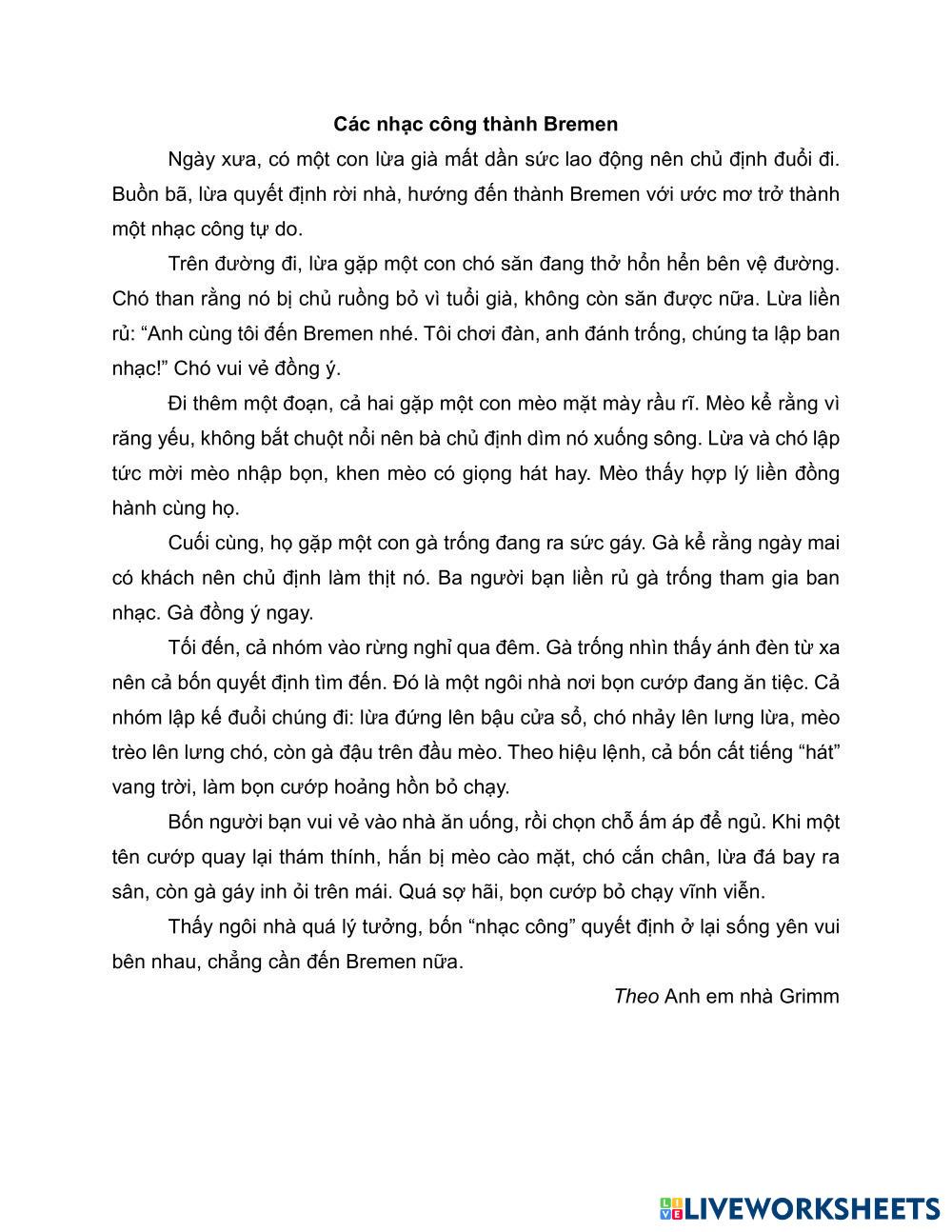 Created by TianTran ESL Vietnamese B1 Reading Vietnamese Author's Instructions Học sinh đọc văn bản rồi trả lời các câu hỏi bên dưới. My Google Classroom Courses × 0 classes selected (0 students total) Quick Access Select all classes (0 classes) All Classes Loading courses... Cancel Share Share to selected Course __COURSE_NAME__ __STUDENT_NAME__ (__STUDENT_EMAIL__) Các nhạc công thành Bremen Download Worksheet Validation Check my answers Emails my answers to my teacher Full name Group/level School subject Teacher's email or key code Close Submit Validating worksheet... (12) Your answers have been sent to your teacher. Good luck! OK We encountered an error submitting your answers. Please try again. OK Advertisement | Go Ad Free Created by TianTran ESL Vietnamese B1 Reading Vietnamese Author's Instructions Học sinh đọc văn bản rồi trả lời các câu hỏi bên dưới. Explore Worksheets Cậu bé người gỗ Pinocchio ESL B1 Cậu bé người gỗ Pinocchio Reading - ESL Học sinh đọc văn bản rồi trả lời các câu hỏi bên dưới. Vịt con xấu xí ESL B1 Vịt con xấu xí Reading - ESL Học sinh đọc văn bản rồi trả lời các câu hỏi bên dưới. ĐỀ ÔN THI TN THPT SỐ 1 PHẦN TRUYỆN ESL B1 ĐỀ ÔN THI TN THPT SỐ 1 PHẦN TRUYỆN Reading - ESL ĐỀ ÔN THI TỐT NGHIỆP THPT SỐ 1 PHẦN TRUYỆN văn ESL B1 văn Reading - ESL hoàn thành