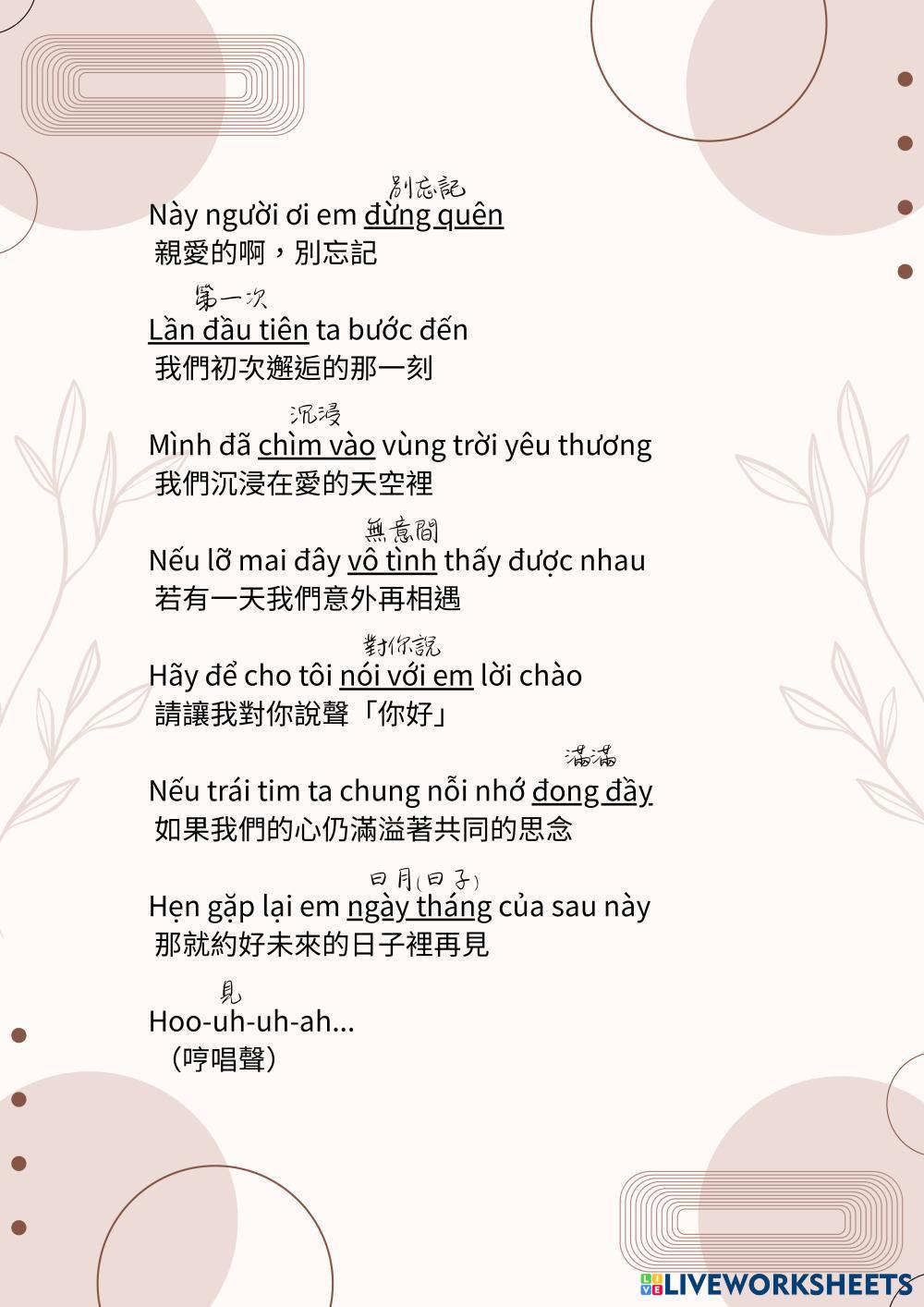 Created by葉文靜 ESL Vietnamese A1-Beginner Speaking Vietnamese Author's Instructions 同學們,跟著大聲唱~ My Google Classroom Courses × 0 classes selected (0 students total) Quick Access Select all classes (0 classes) All Classes Loading courses... Cancel Share Share to selected Course __COURSE_NAME__ __STUDENT_NAME__ (__STUDENT_EMAIL__) 越南語歌曲教學_我和青春有個約會 Download Worksheet Validation Check my answers Emails my answers to my teacher Full name Group/level School subject Teacher's email or key code Close Submit Validating worksheet... (12) Your answers have been sent to your teacher. Good luck! OK We encountered an error submitting your answers. Please try again. OK Advertisement | Go Ad Free Created by葉文靜 ESL Vietnamese A1-Beginner Speaking Vietnamese Author's Instructions 同學們,跟著大聲唱~ Explore Worksheets C3. Kitchen ESL A1-Beginner C3. Kitchen Speaking - ESL Review some tools in the kitchen. TEst - TN2 Unit 3 Lesson 4 ESL A1-Beginner TEst - TN2 Unit 3 Lesson 4 Speaking - ESL TEst - TN2 Unit 3 Lesson 4 Bebop3 - EE & EA ESL A1-Beginner Bebop3 - EE & EA Speaking - ESL read and complete the tasks Kids Starters ESL A1-Beginner Kids Starters Speaking - ESL Share it - Kids Starters