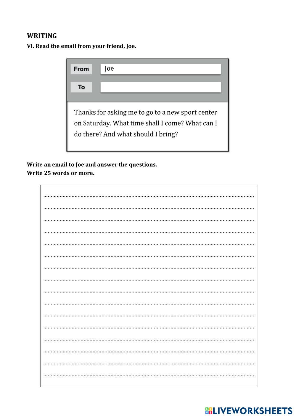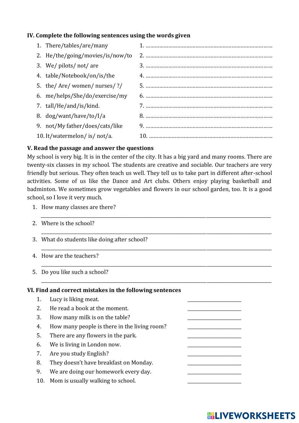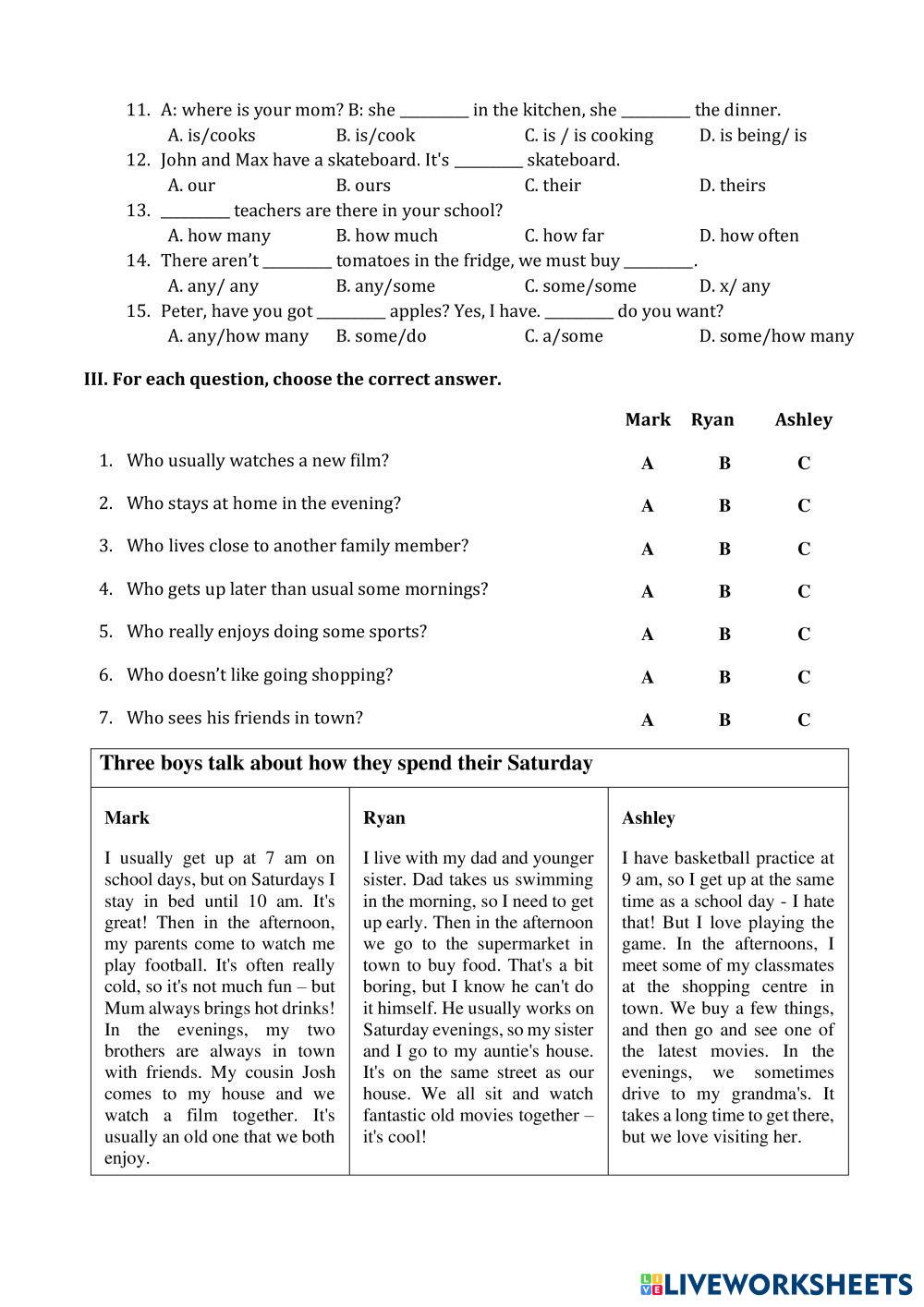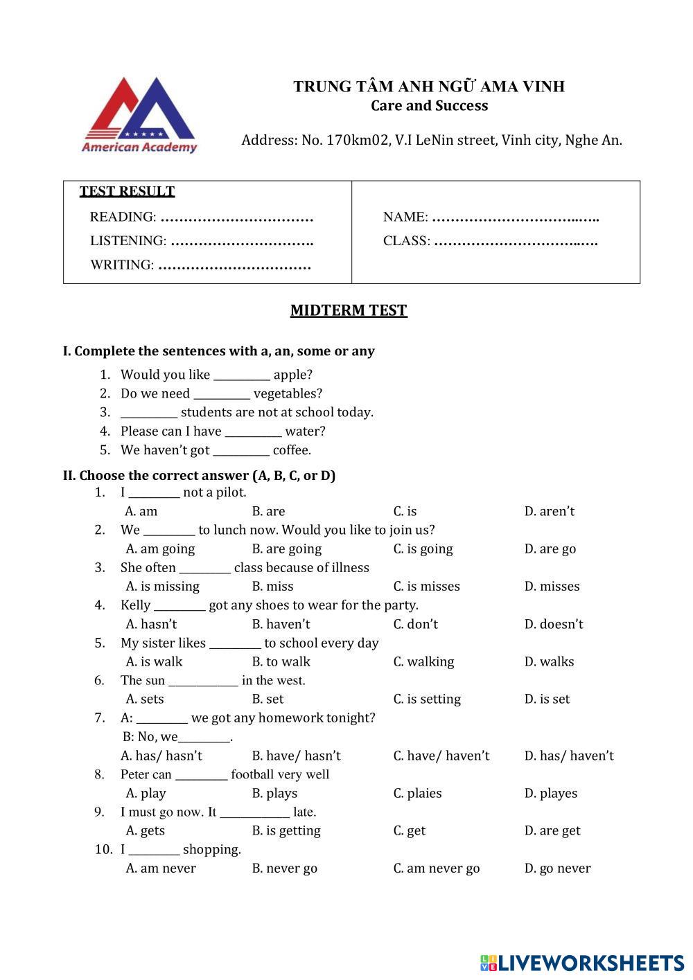 Created byThái Thị Xoan ESL A2 KET Age 10-15 level: A2 Vietnamese Author's Instructions My Google Classroom Courses × 0 classes selected (0 students total) Quick Access Select all classes (0 classes) All Classes Loading courses... Cancel Share Share to selected Course __COURSE_NAME__ __STUDENT_NAME__ (__STUDENT_EMAIL__) MID TEST 1ST KET A2 Download Worksheet Validation Check my answers Emails my answers to my teacher Full name Group/level School subject Teacher's email or key code Close Submit Validating worksheet... (12) Your answers have been sent to your teacher. Good luck! OK We encountered an error submitting your answers. Please try again. OK Advertisement | Go Ad Free Created byThái Thị Xoan ESL A2 KET Age 10-15 level: A2 Vietnamese Author's Instructions
