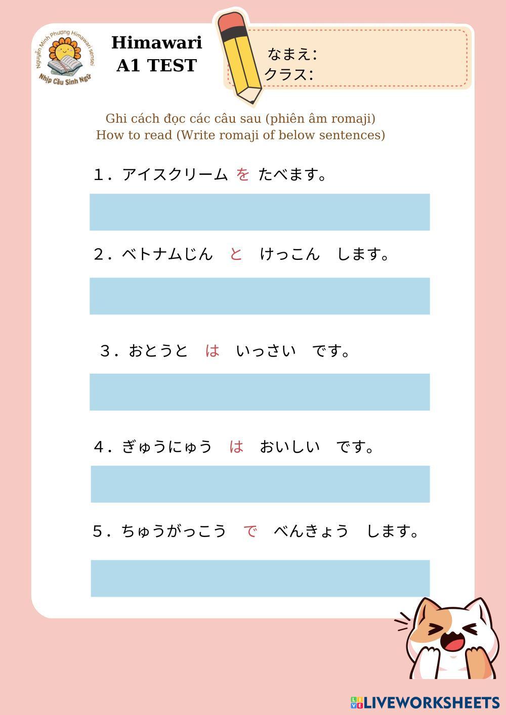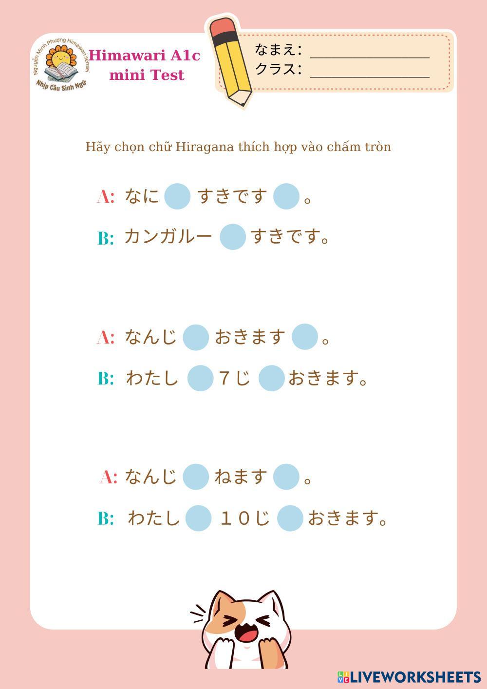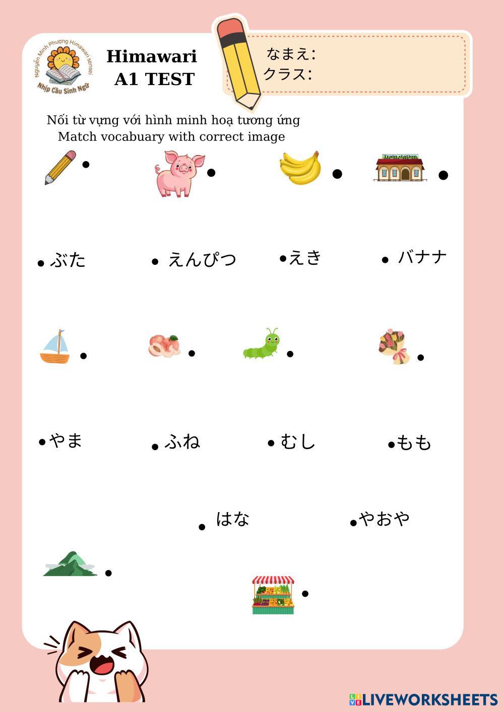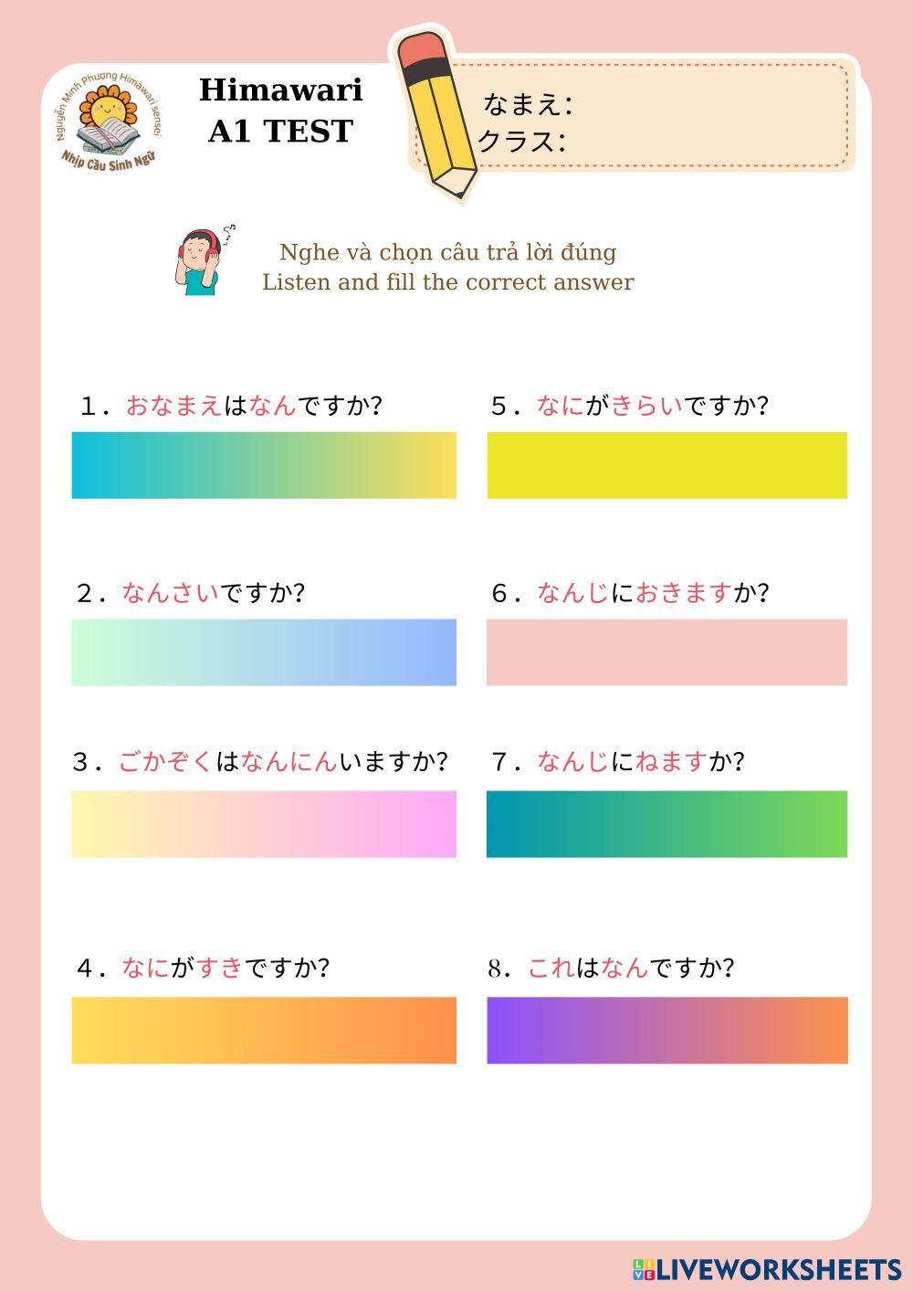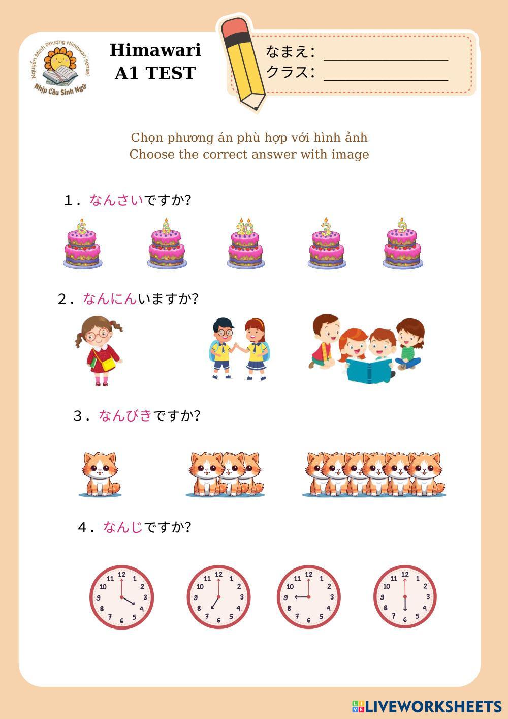 Created byNguyễn Thị Minh Phượng Himawari A1 TEST 082024 Himawari A1 TEST 082024 Age 8-15 level: 1 Vietnamese Author's Instructions Himawari A1 TEST 10/2024 My Google Classroom Courses × 0 classes selected (0 students total) Quick Access Select all classes (0 classes) All Classes Loading courses... Cancel Share Share to selected Course __COURSE_NAME__ __STUDENT_NAME__ (__STUDENT_EMAIL__) Himawari A1 TEST 10/2024 Download Worksheet Validation Check my answers Emails my answers to my teacher Full name Group/level School subject Teacher's email or key code Close Submit Validating worksheet... (12) Your answers have been sent to your teacher. Good luck! OK We encountered an error submitting your answers. Please try again. OK Advertisement | Go Ad Free Created byNguyễn Thị Minh Phượng Himawari A1 TEST 082024 Himawari A1 TEST 082024 Age 8-15 level: 1 Vietnamese Author's Instructions Himawari A1 TEST 10/2024