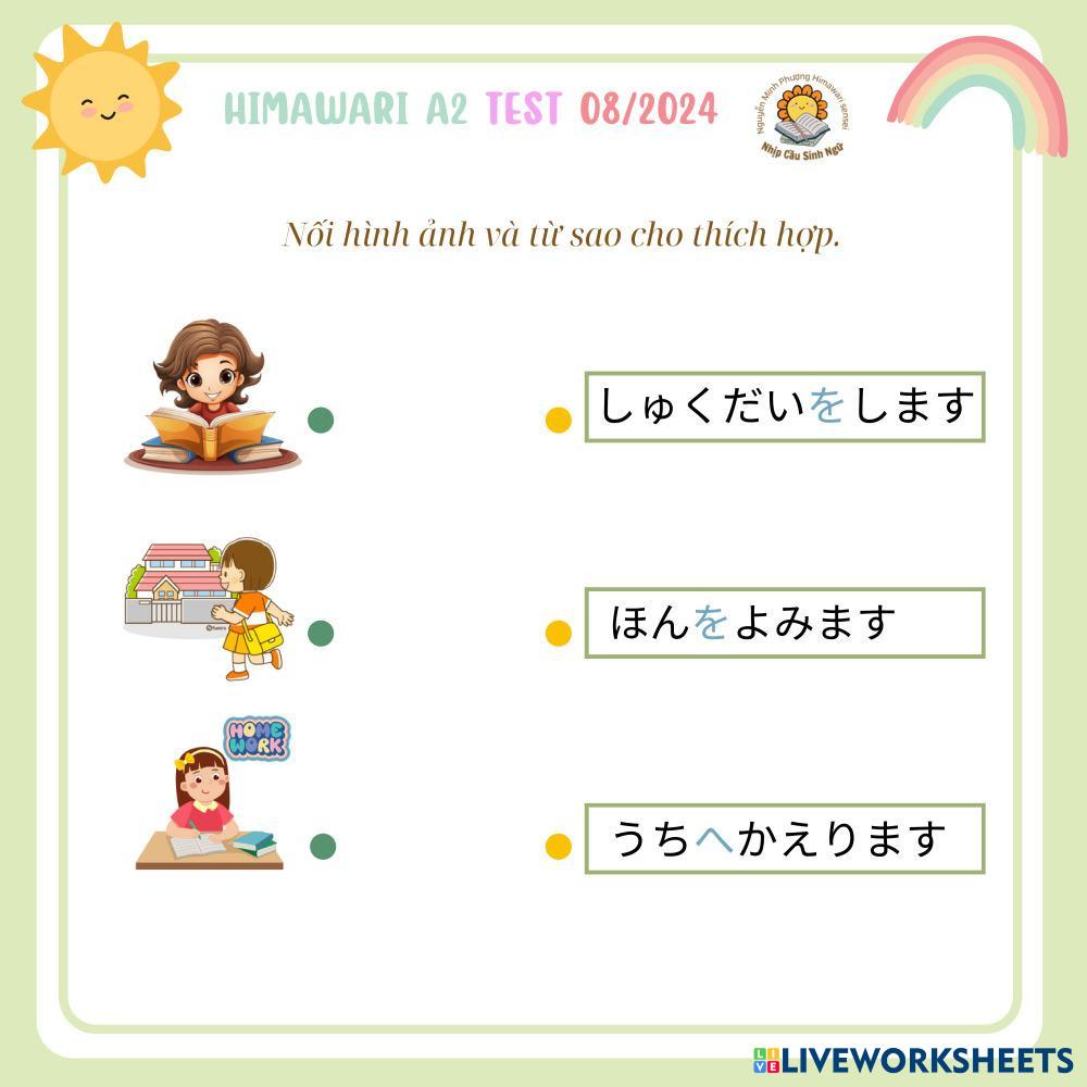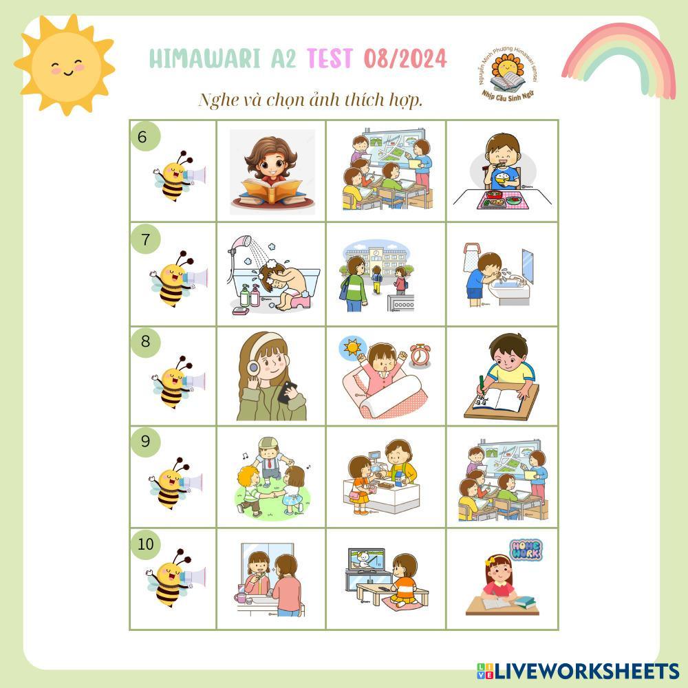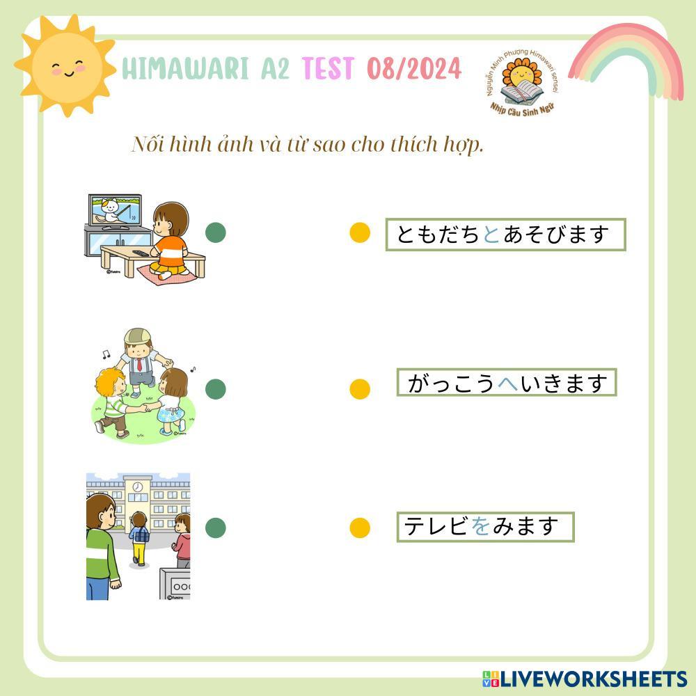 Created byNguyễn Thị Minh Phượng Himawari A2 TEST 082024 Himawari A2 TEST 082024 Age 8-17 level: 1 Vietnamese Author's Instructions My Google Classroom Courses × 0 classes selected (0 students total) Quick Access Select all classes (0 classes) All Classes Loading courses... Cancel Share Share to selected Course __COURSE_NAME__ __STUDENT_NAME__ (__STUDENT_EMAIL__) Himawari A2 TEST 082024 Download Worksheet Validation Check my answers Emails my answers to my teacher Full name Group/level School subject Teacher's email or key code Close Submit Validating worksheet... (12) Your answers have been sent to your teacher. Good luck! OK We encountered an error submitting your answers. Please try again. OK Advertisement | Go Ad Free Created byNguyễn Thị Minh Phượng Himawari A2 TEST 082024 Himawari A2 TEST 082024 Age 8-17 level: 1 Vietnamese Author's Instructions