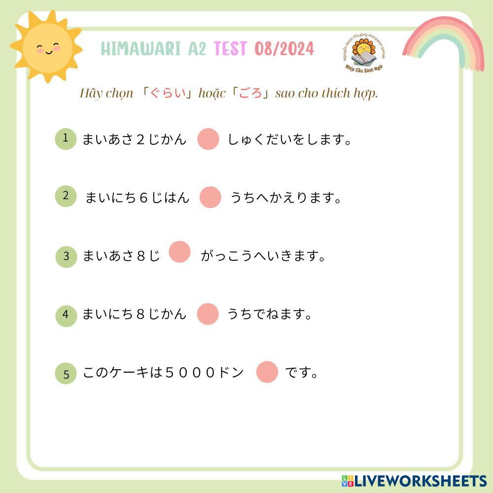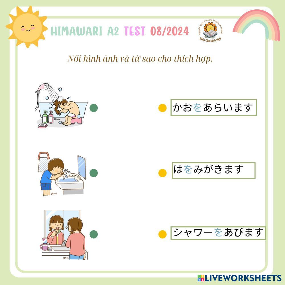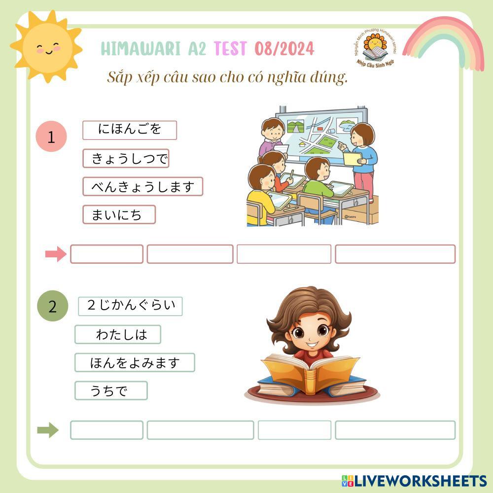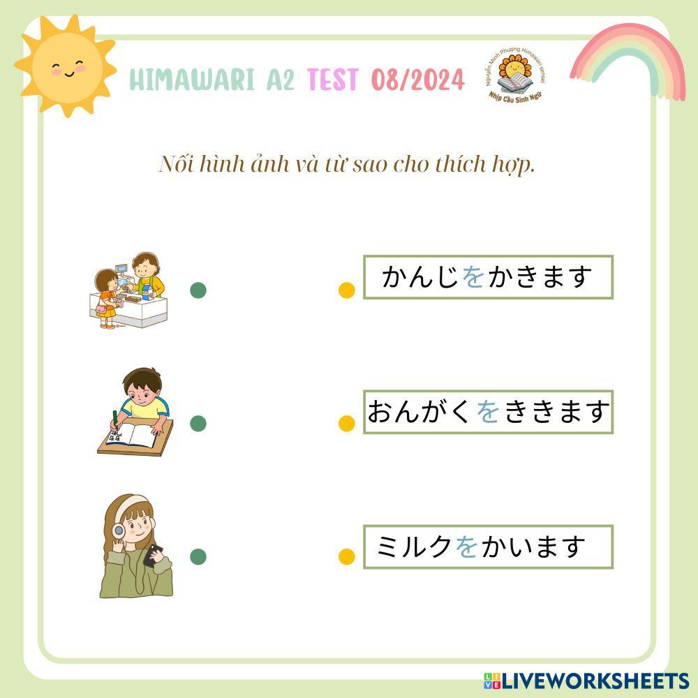 Created byNguyễn Thị Minh Phượng Himawari A2 TEST 082024 Himawari A2 TEST 082024 Age 8-17 level: 1 Vietnamese Author's Instructions My Google Classroom Courses × 0 classes selected (0 students total) Quick Access Select all classes (0 classes) All Classes Loading courses... Cancel Share Share to selected Course __COURSE_NAME__ __STUDENT_NAME__ (__STUDENT_EMAIL__) Himawari A2 TEST 082024 Download Worksheet Validation Check my answers Emails my answers to my teacher Full name Group/level School subject Teacher's email or key code Close Submit Validating worksheet... (12) Your answers have been sent to your teacher. Good luck! OK We encountered an error submitting your answers. Please try again. OK Advertisement | Go Ad Free Created byNguyễn Thị Minh Phượng Himawari A2 TEST 082024 Himawari A2 TEST 082024 Age 8-17 level: 1 Vietnamese Author's Instructions