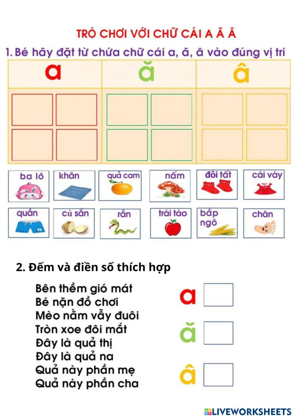 Created byLê Thị Thanh Nhàn lam quen chữ cái chữ cái Age 5-8 level: medium Vietnamese Author's Instructions My Google Classroom Courses × 0 classes selected (0 students total) Quick Access Select all classes (0 classes) All Classes Loading courses... Cancel Share Share to selected Course __COURSE_NAME__ __STUDENT_NAME__ (__STUDENT_EMAIL__) Bé học chữ cái Download Worksheet Validation Check my answers Emails my answers to my teacher Full name Group/level School subject Teacher's email or key code Close Submit Validating worksheet... (12) Your answers have been sent to your teacher. Good luck! OK We encountered an error submitting your answers. Please try again. OK Advertisement | Go Ad Free Created byLê Thị Thanh Nhàn lam quen chữ cái chữ cái Age 5-8 level: medium Vietnamese Author's Instructions
