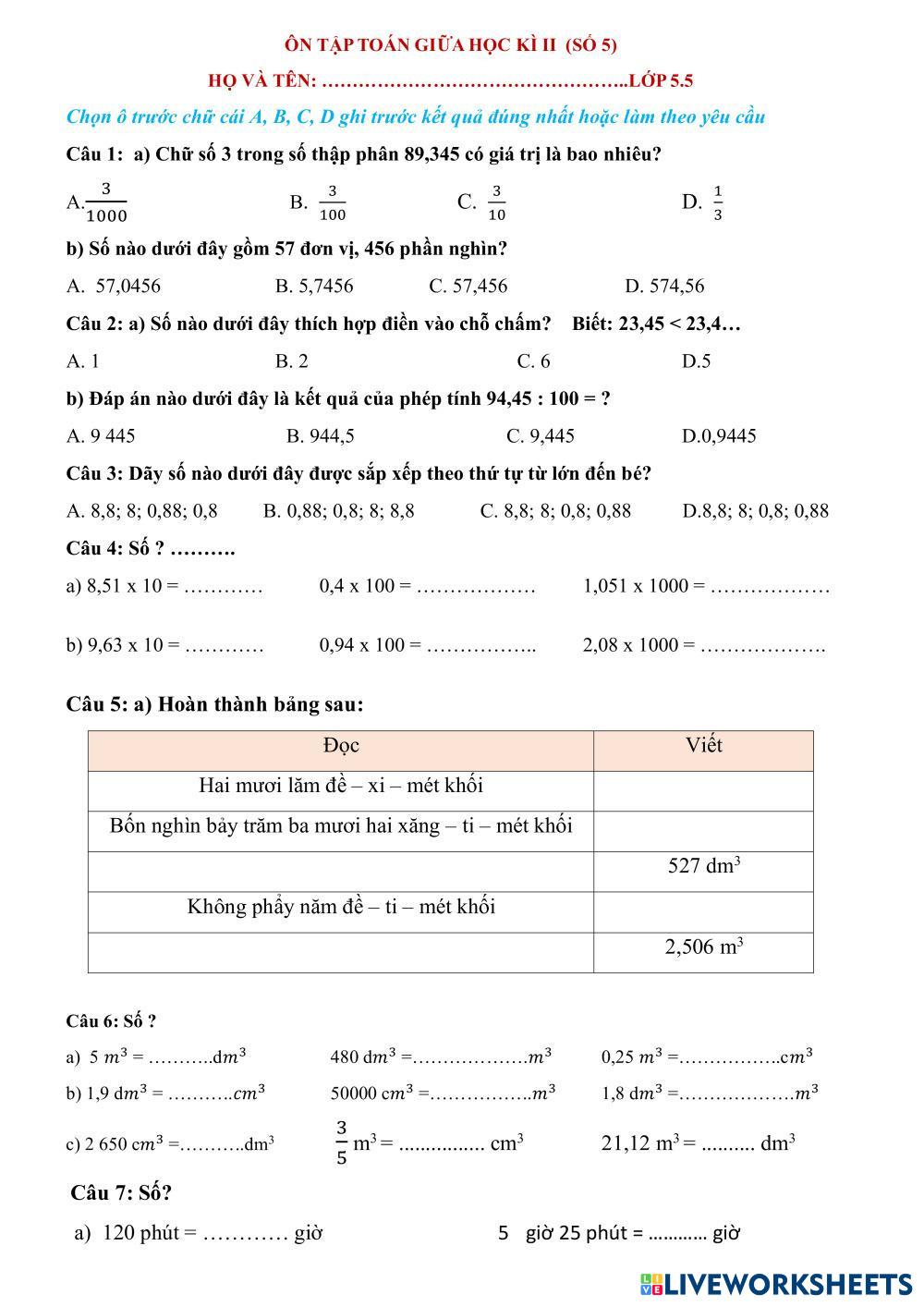 Created by suongnguyen2 Math Elementary 5th grade Place Value Vietnamese Author's Instructions Chọn đáp án đúng My Google Classroom Courses × 0 classes selected (0 students total) Quick Access Select all classes (0 classes) All Classes Loading courses... Cancel Share Share to selected Course __COURSE_NAME__ __STUDENT_NAME__ (__STUDENT_EMAIL__) ÔN TẬP TOÁN GIỮA HỌC KÌ II Download Worksheet Validation Check my answers Emails my answers to my teacher Full name Group/level School subject Teacher's email or key code Close Submit Validating worksheet... (12) Your answers have been sent to your teacher. Good luck! OK We encountered an error submitting your answers. Please try again. OK Advertisement | Go Ad Free Created by suongnguyen2 Math Elementary 5th grade Place Value Vietnamese Author's Instructions Chọn đáp án đúng Explore Worksheets Place Value Worksheet Math 5th grade Place Value Worksheet Place Value - Math Learning place value from ones to millions for kids. Numeración para angelinos Math 5th grade Numeración para angelinos Place Value - Math Escribe el número Hoạt động nhóm. Math 5th grade Hoạt động nhóm. Place Value - Math Hoạt động nhóm Hoạt động nhóm Math 5th grade Hoạt động nhóm Place Value - Math Điền vào ô trống