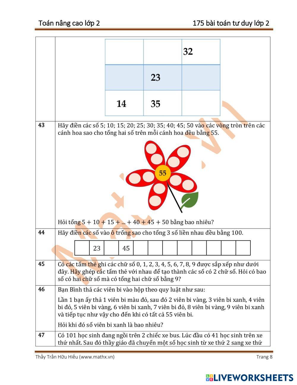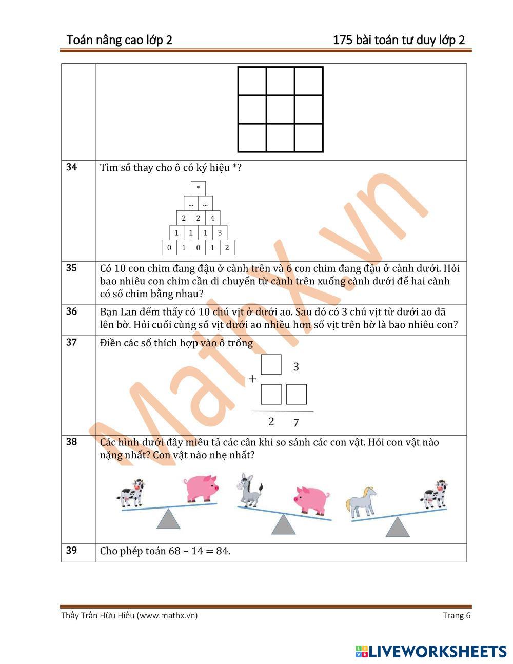 Created by myminmang Môn Toán-Math Math Age 7-11 level: G2 Vietnamese Author's Instructions My Google Classroom Courses × 0 classes selected (0 students total) Quick Access Select all classes (0 classes) All Classes Loading courses... Cancel Share Share to selected Course __COURSE_NAME__ __STUDENT_NAME__ (__STUDENT_EMAIL__) 175-BAI-TOAN-TU-DUY-34-65 Download Worksheet Validation Check my answers Emails my answers to my teacher Full name Group/level School subject Teacher's email or key code Close Submit Validating worksheet... (12) Your answers have been sent to your teacher. Good luck! OK We encountered an error submitting your answers. Please try again. OK Advertisement | Go Ad Free Created by myminmang Môn Toán-Math Math Age 7-11 level: G2 Vietnamese Author's Instructions