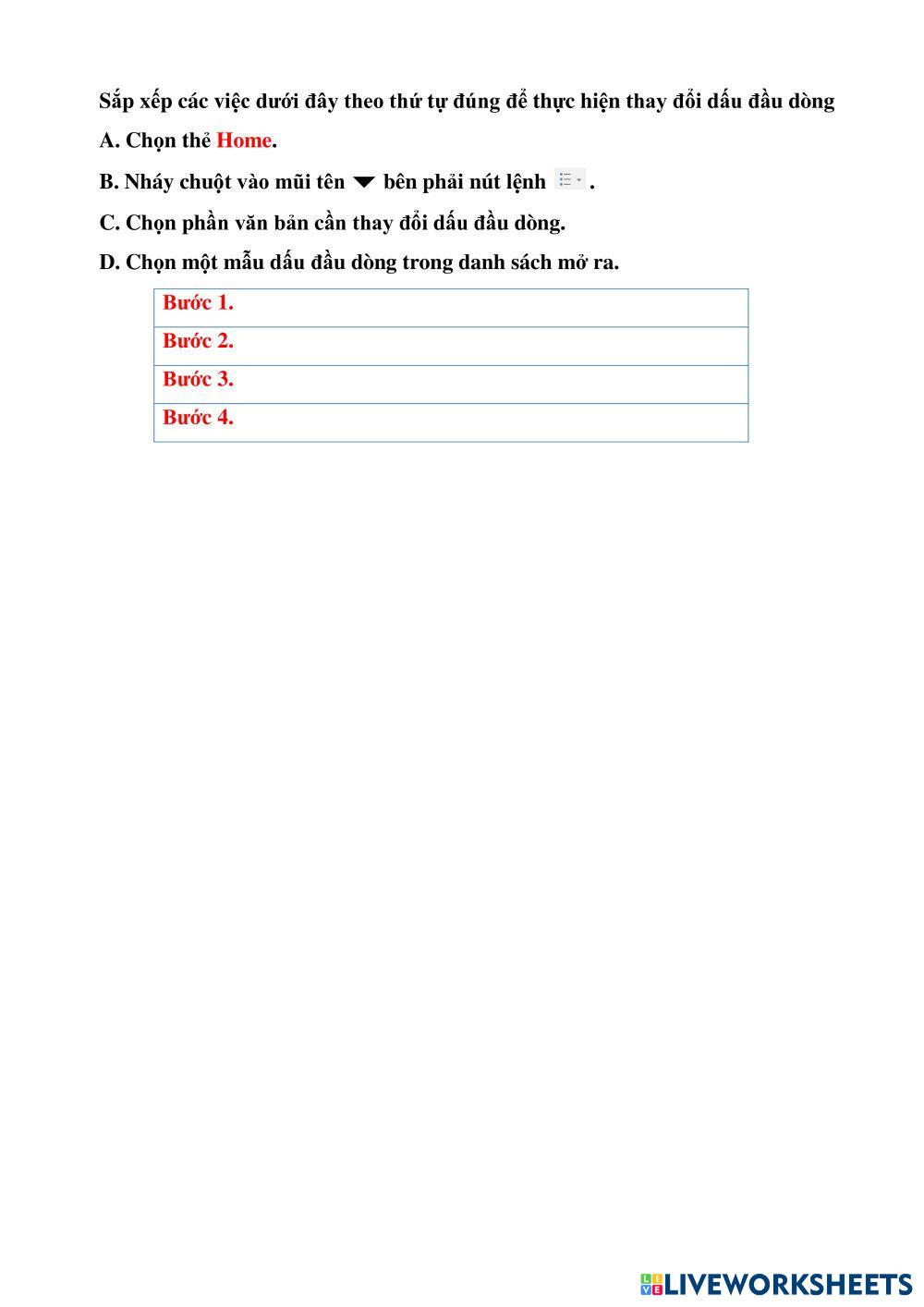 Created by Phanphuongtht1 Sắp xếp Sắp xếp Age 8-14 level: K4 Vietnamese Author's Instructions My Google Classroom Courses × 0 classes selected (0 students total) Quick Access Select all classes (0 classes) All Classes Loading courses... Cancel Share Share to selected Course __COURSE_NAME__ __STUDENT_NAME__ (__STUDENT_EMAIL__) Bài trình chiếu của em (dấu đầu dòng) Download Worksheet Validation Check my answers Emails my answers to my teacher Full name Group/level School subject Teacher's email or key code Close Submit Validating worksheet... (12) Your answers have been sent to your teacher. Good luck! OK We encountered an error submitting your answers. Please try again. OK Advertisement | Go Ad Free Created by Phanphuongtht1 Sắp xếp Sắp xếp Age 8-14 level: K4 Vietnamese Author's Instructions