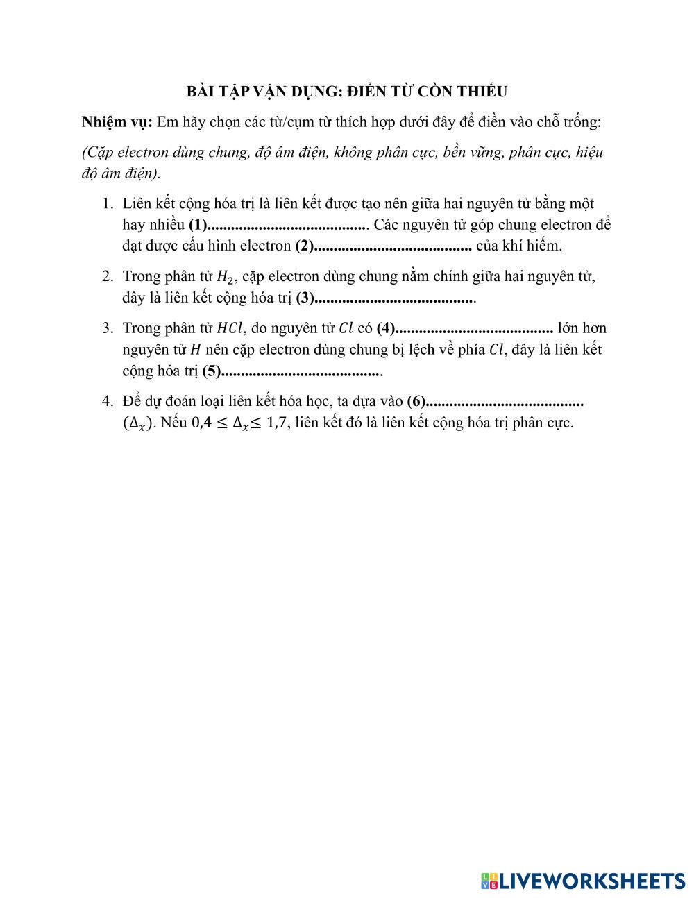 Created byNguyen Dinh Phong Science High School 10th grade Chemistry Vietnamese Author's Instructions Chúc các em làm bài tốt My Google Classroom Courses × 0 classes selected (0 students total) Quick Access Select all classes (0 classes) All Classes Loading courses... Cancel Share Share to selected Course __COURSE_NAME__ __STUDENT_NAME__ (__STUDENT_EMAIL__) Bài tập vận dụng Download Worksheet Validation Check my answers Emails my answers to my teacher Full name Group/level School subject Teacher's email or key code Close Submit Validating worksheet... (12) Your answers have been sent to your teacher. Good luck! OK We encountered an error submitting your answers. Please try again. OK Advertisement | Go Ad Free Created byNguyen Dinh Phong Science High School 10th grade Chemistry Vietnamese Author's Instructions Chúc các em làm bài tốt Explore Worksheets Particle and Mole Relationships Science 10th grade Particle and Mole Relationships Chemistry - Science Interpret the following balanced equations in terms of moles, mass, and representative particles. Acid base titration Science 10th grade Acid base titration Chemistry - Science مقارنة بين الاحماض والقواعد Science 10th grade مقارنة بين الاحماض والقواعد Chemistry - Science قارني مقارنة بين الأحماض والقواعد Science 10th grade مقارنة بين الأحماض والقواعد Chemistry - Science قارني بين الاحماض والقواعد