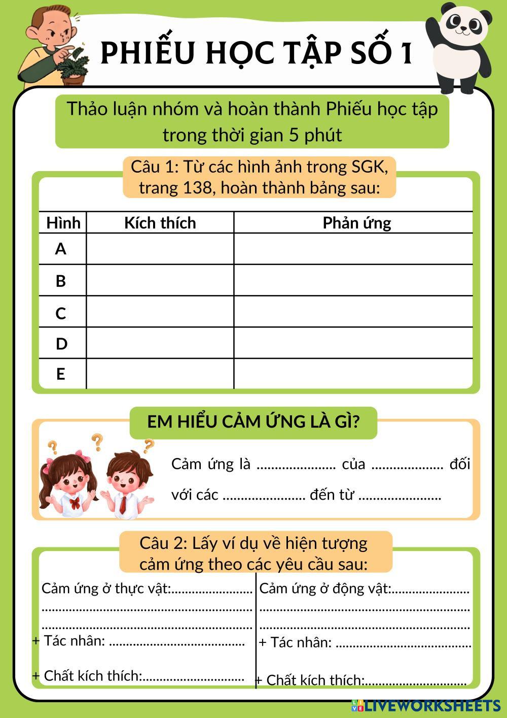 Học sinh tham khảo hình ảnh hiện tượng cảm ứng SGK/138 để hoàn thành PHT