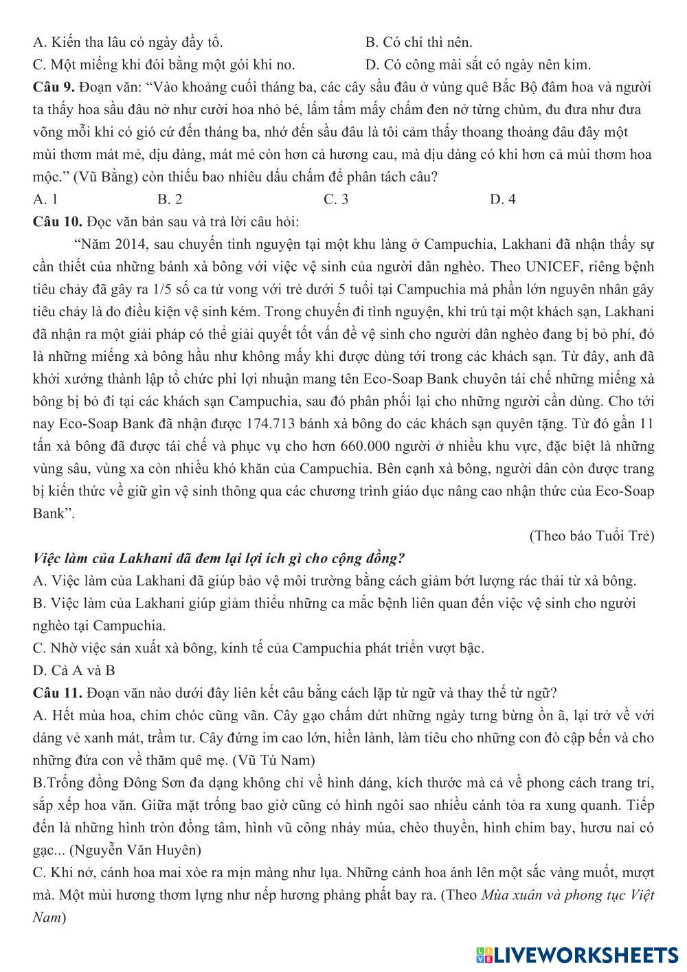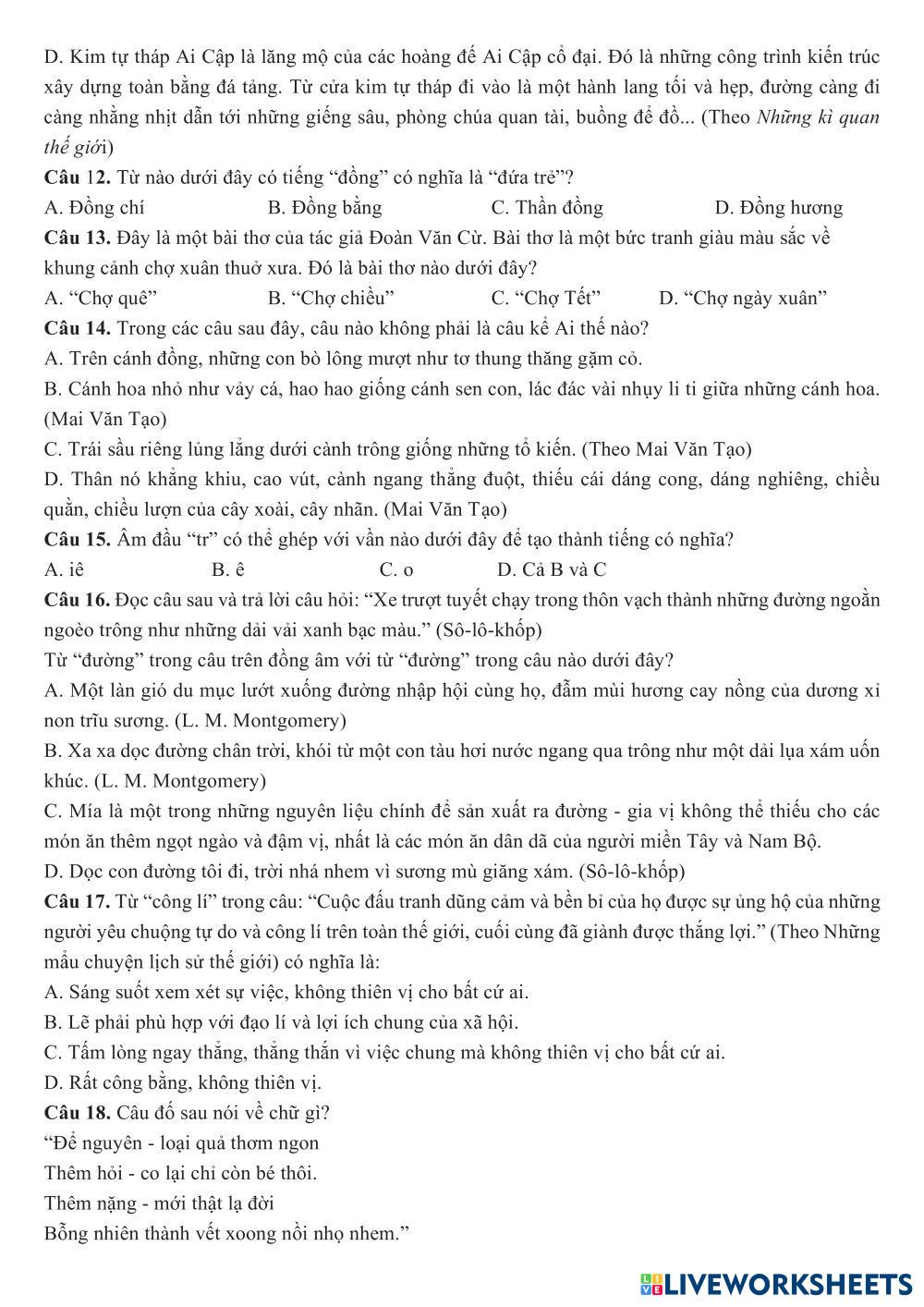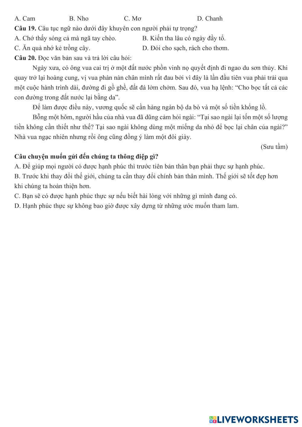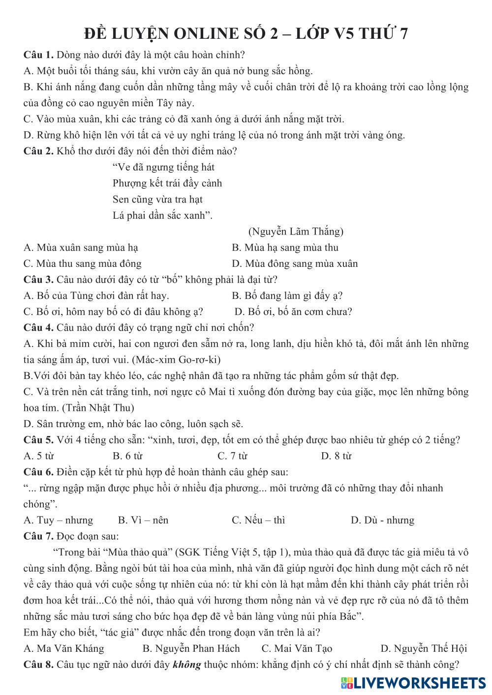 Đề luyện online số 2 (lớp thứ 7)
