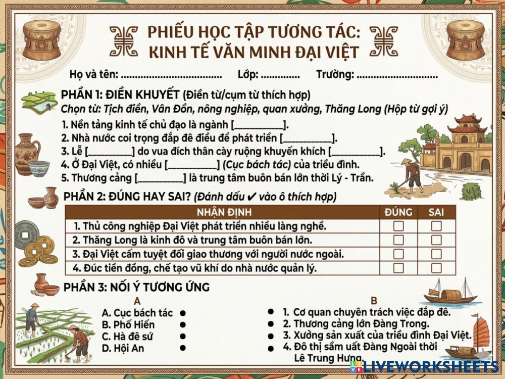 Created byTranHuyenTran Social Studies High School 10th grade History Vietnamese Author's Instructions sdeff My Google Classroom Courses × 0 classes selected (0 students total) Quick Access Select all classes (0 classes) All Classes Loading courses... Cancel Share Share to selected Course __COURSE_NAME__ __STUDENT_NAME__ (__STUDENT_EMAIL__) Kinh tế Đại Việt Download Worksheet Validation Check my answers Emails my answers to my teacher Full name Group/level School subject Teacher's email or key code Close Submit Validating worksheet... (12) Your answers have been sent to your teacher. Good luck! OK We encountered an error submitting your answers. Please try again. OK Advertisement | Go Ad Free Created byTranHuyenTran Social Studies High School 10th grade History Vietnamese Author's Instructions sdeff Explore Worksheets Ý nghĩa văn minh Đại Việt Social Studies 10th grade Ý nghĩa văn minh Đại Việt History - Social Studies hihi Kinh tế Đại Việt Social Studies 10th grade Kinh tế Đại Việt History - Social Studies sdeff Kinh tế Đại Việt Social Studies 10th grade Kinh tế Đại Việt History - Social Studies sdeff חטא עץ הדעת Social Studies 10th grade חטא עץ הדעת History - Social Studies ענו על השאלות