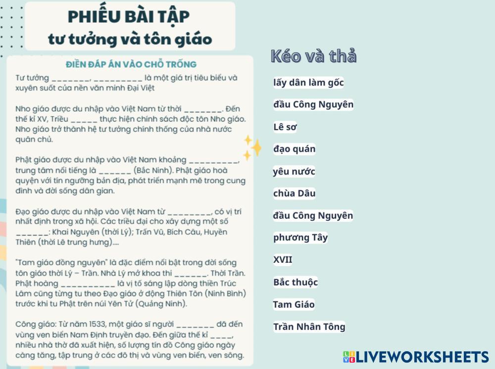 Created byTranHuyenTran Social Studies High School 10th grade History Vietnamese Author's Instructions Tư tưởng và tôn giáo My Google Classroom Courses × 0 classes selected (0 students total) Quick Access Select all classes (0 classes) All Classes Loading courses... Cancel Share Share to selected Course __COURSE_NAME__ __STUDENT_NAME__ (__STUDENT_EMAIL__) Tư tưởng và tôn giáo Download Worksheet Validation Check my answers Emails my answers to my teacher Full name Group/level School subject Teacher's email or key code Close Submit Validating worksheet... (12) Your answers have been sent to your teacher. Good luck! OK We encountered an error submitting your answers. Please try again. OK Advertisement | Go Ad Free Created byTranHuyenTran Social Studies High School 10th grade History Vietnamese Author's Instructions Tư tưởng và tôn giáo Explore Worksheets Giáo dục Social Studies 10th grade Giáo dục History - Social Studies Giáo dục Quá trình phát triển Social Studies 10th grade Quá trình phát triển History - Social Studies Quá trình phát triển Khái niệm và cơ sở hình thành Social Studies 10th grade Khái niệm và cơ sở hình thành History - Social Studies hihi Ý nghĩa văn minh Đại Việt Social Studies 10th grade Ý nghĩa văn minh Đại Việt History - Social Studies hihi