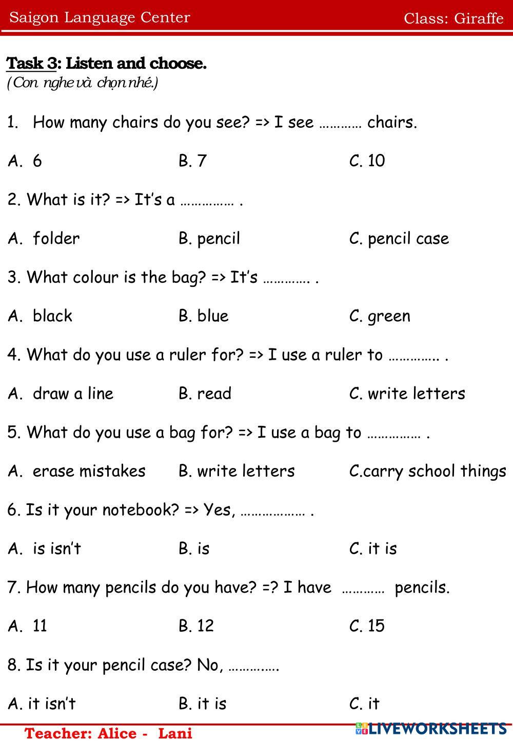 Created byNguyễn Thị ThanhThao Tieng Anh unit 1 Age 10-16 level: ffs1 Vietnamese Author's Instructions e My Google Classroom Courses × 0 classes selected (0 students total) Quick Access Select all classes (0 classes) All Classes Loading courses... Cancel Share Share to selected Course __COURSE_NAME__ __STUDENT_NAME__ (__STUDENT_EMAIL__) Giraffe Download Worksheet Validation Check my answers Emails my answers to my teacher Full name Group/level School subject Teacher's email or key code Close Submit Validating worksheet... (12) Your answers have been sent to your teacher. Good luck! OK We encountered an error submitting your answers. Please try again. OK Advertisement | Go Ad Free Created byNguyễn Thị ThanhThao Tieng Anh unit 1 Age 10-16 level: ffs1 Vietnamese Author's Instructions e