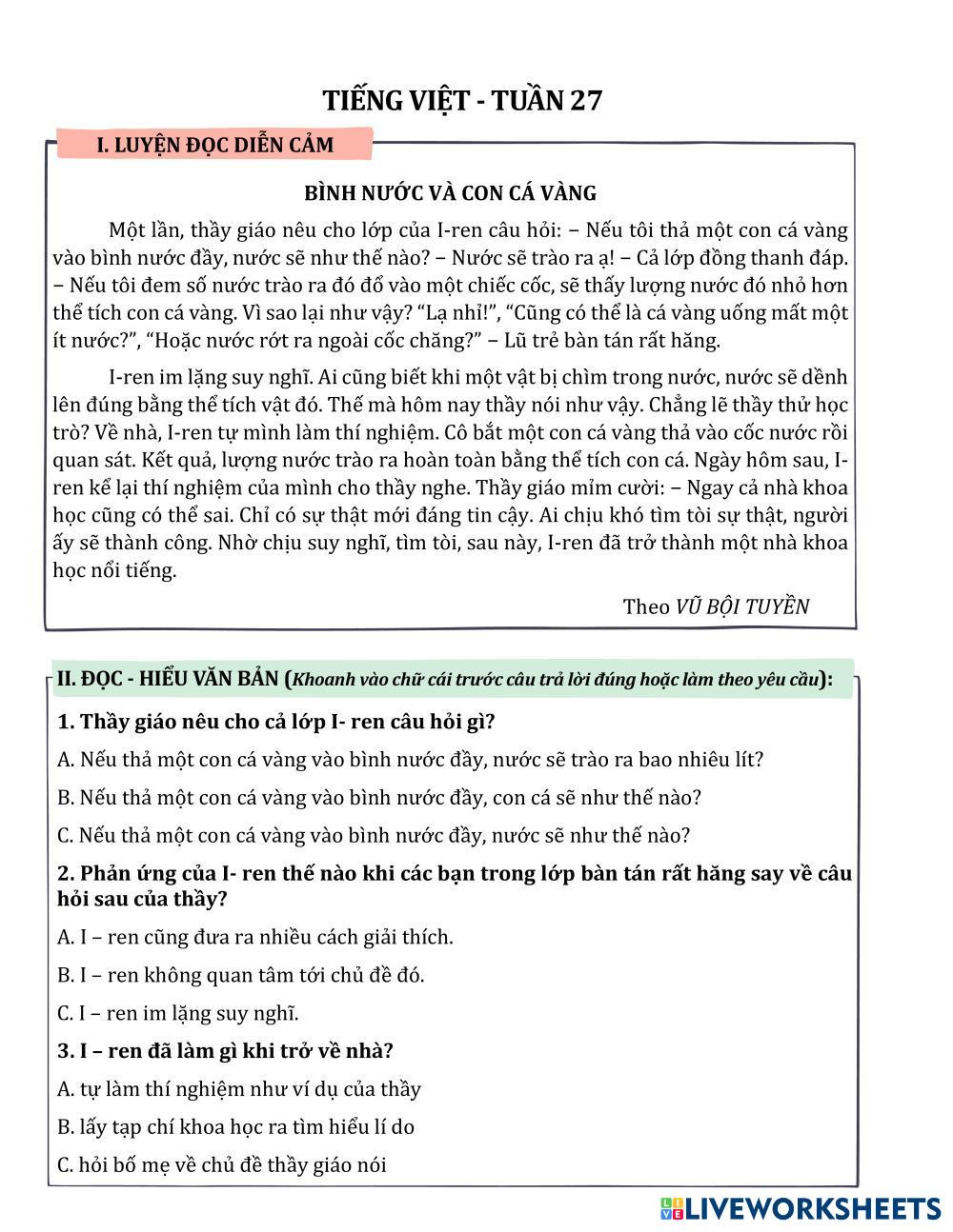 Created bynguyễn thị trà my Tieng viet Đọc hiểu Age 8-12 level: 3 Vietnamese Author's Instructions My Google Classroom Courses × 0 classes selected (0 students total) Quick Access Select all classes (0 classes) All Classes Loading courses... Cancel Share Share to selected Course __COURSE_NAME__ __STUDENT_NAME__ (__STUDENT_EMAIL__) Đọc hiểu tuần 27 - lớp 3 Download Worksheet Validation Check my answers Emails my answers to my teacher Full name Group/level School subject Teacher's email or key code Close Submit Validating worksheet... (12) Your answers have been sent to your teacher. Good luck! OK We encountered an error submitting your answers. Please try again. OK Advertisement | Go Ad Free Created bynguyễn thị trà my Tieng viet Đọc hiểu Age 8-12 level: 3 Vietnamese Author's Instructions