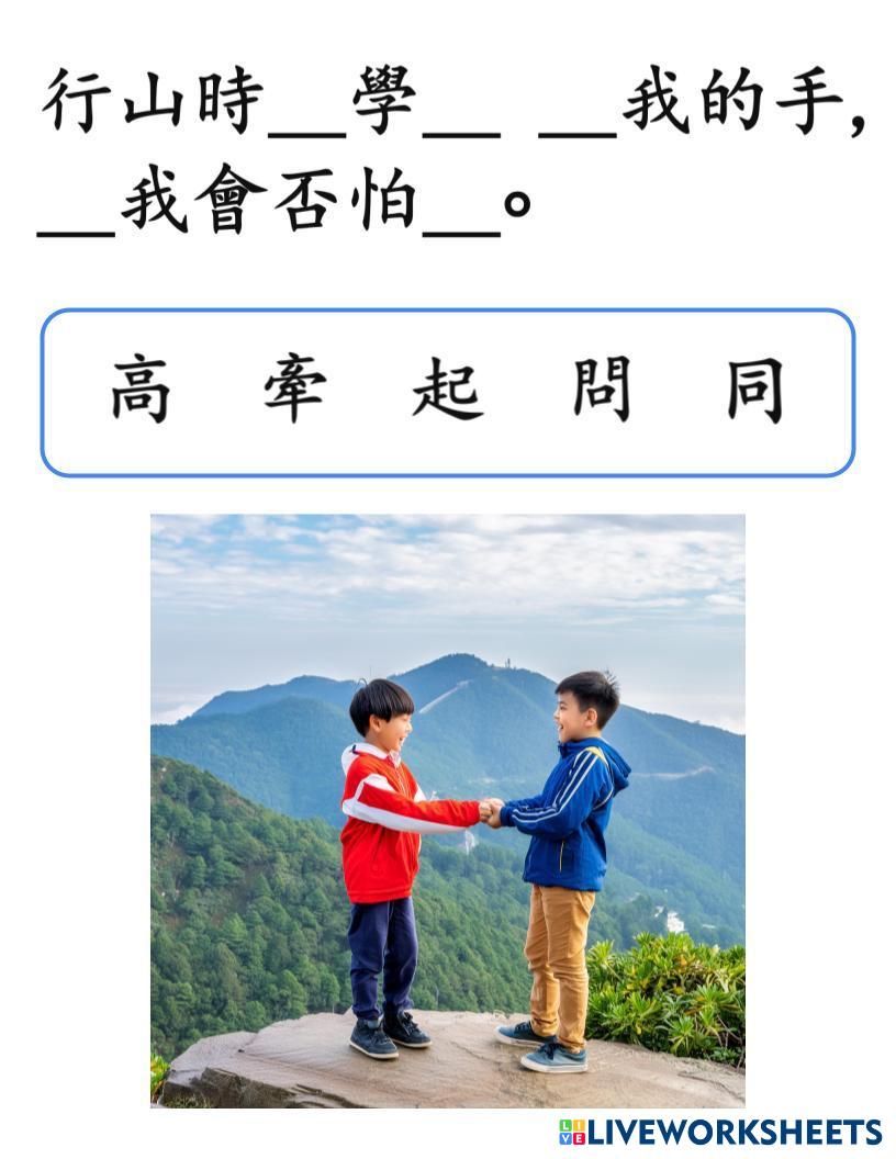 Created by TheWongWay Cantonese Cantonese Age 6+ level: Elementary Chinese Author's Instructions My Google Classroom Courses × 0 classes selected (0 students total) Quick Access Select all classes (0 classes) All Classes Loading courses... Cancel Share Share to selected Course __COURSE_NAME__ __STUDENT_NAME__ (__STUDENT_EMAIL__) Wk sht 1.2C 中文常用三千字 Download Worksheet Validation Check my answers Emails my answers to my teacher Full name Group/level School subject Teacher's email or key code Close Submit Validating worksheet... (12) Your answers have been sent to your teacher. Good luck! OK We encountered an error submitting your answers. Please try again. OK Advertisement | Go Ad Free Created by TheWongWay Cantonese Cantonese Age 6+ level: Elementary Chinese Author's Instructions