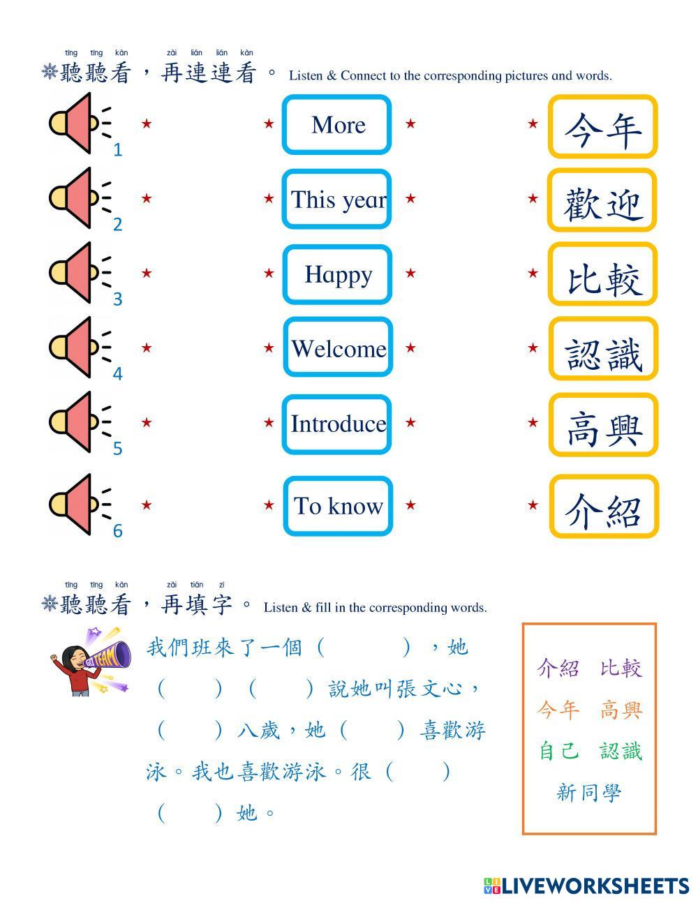 Created byMei Huei Kao Chinese Language Listening Age 8-17 level: 2 Chinese Author's Instructions My Google Classroom Courses × 0 classes selected (0 students total) Quick Access Select all classes (0 classes) All Classes Loading courses... Cancel Share Share to selected Course __COURSE_NAME__ __STUDENT_NAME__ (__STUDENT_EMAIL__) 學華語向前走第二冊第一課A Download Worksheet Validation Check my answers Emails my answers to my teacher Full name Group/level School subject Teacher's email or key code Close Submit Validating worksheet... (12) Your answers have been sent to your teacher. Good luck! OK We encountered an error submitting your answers. Please try again. OK Advertisement | Go Ad Free Created byMei Huei Kao Chinese Language Listening Age 8-17 level: 2 Chinese Author's Instructions