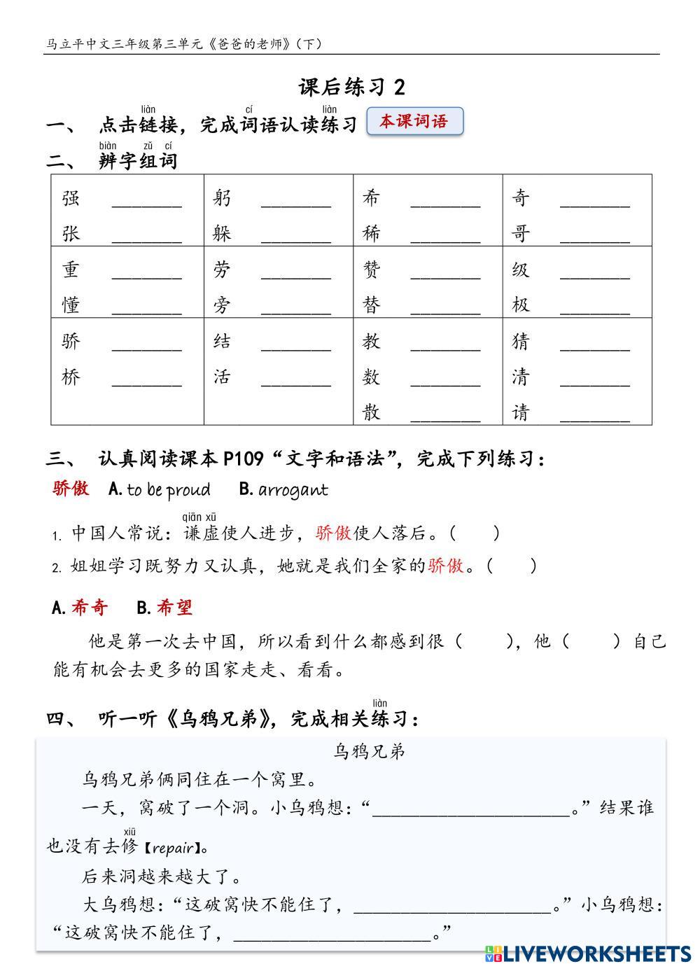 Created byMin Miao ESL A2 Reading Chinese Author's Instructions G3 My Google Classroom Courses × 0 classes selected (0 students total) Quick Access Select all classes (0 classes) All Classes Loading courses... Cancel Share Share to selected Course __COURSE_NAME__ __STUDENT_NAME__ (__STUDENT_EMAIL__) G3-3-2《爸爸的老师》(下)2 Download Worksheet Validation Check my answers Emails my answers to my teacher Full name Group/level School subject Teacher's email or key code Close Submit Validating worksheet... (12) Your answers have been sent to your teacher. Good luck! OK We encountered an error submitting your answers. Please try again. OK Advertisement | Go Ad Free Created byMin Miao ESL A2 Reading Chinese Author's Instructions G3 Explore Worksheets USE YOUR IMAGINATION ESL A2 USE YOUR IMAGINATION Reading - ESL Please complete the exercises that we have previously worked on in the classroom. Inbal's Blog ESL A2 Inbal's Blog Reading - ESL Read the text and answer the questions. Membaca teks cerita ESL A2 Membaca teks cerita Reading - ESL Siswa diharapkan mampu memahami bacaan cerita sebelum menjawab soal. Agar ketika menjawab soal sudah paham dan dapat menjawab dengan benar G3-3-3《等一会儿再说》2 ESL A2 G3-3-3《等一会儿再说》2 Reading - ESL G3