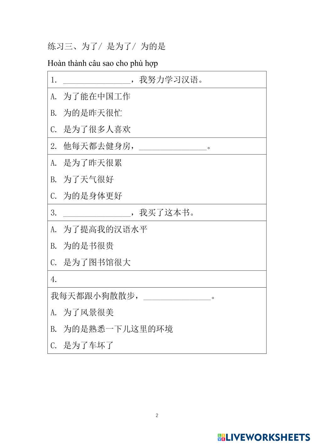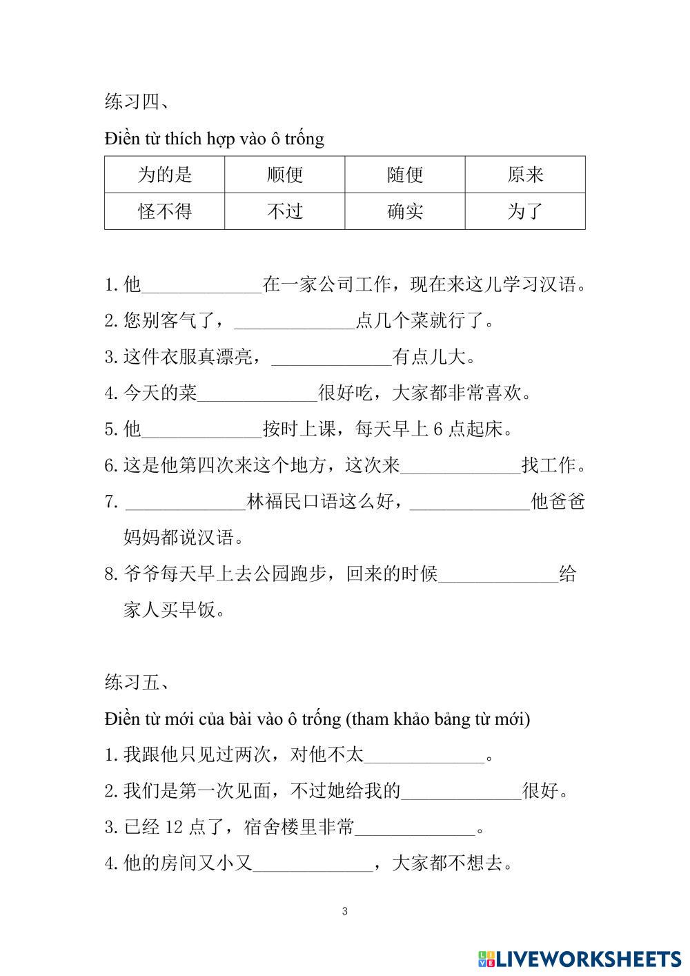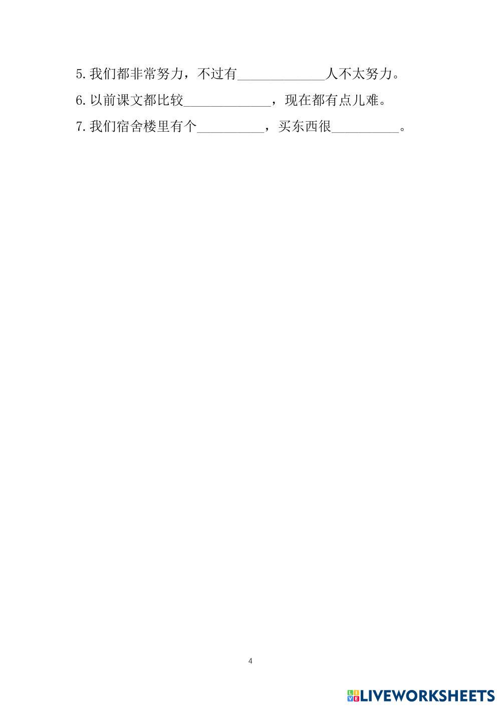 Created byUyenMinh ESL B1 Writing Chinese Author's Instructions 语法: 1、原来…怪不得… 2、不但…而且… 3、为了/ 是为了/ 为的是 4、一些词语 My Google Classroom Courses × 0 classes selected (0 students total) Quick Access Select all classes (0 classes) All Classes Loading courses... Cancel Share Share to selected Course __COURSE_NAME__ __STUDENT_NAME__ (__STUDENT_EMAIL__) 汉语口语-SC3 Download Worksheet Validation Check my answers Emails my answers to my teacher Full name Group/level School subject Teacher's email or key code Close Submit Validating worksheet... (12) Your answers have been sent to your teacher. Good luck! OK We encountered an error submitting your answers. Please try again. OK Advertisement | Go Ad Free Created byUyenMinh ESL B1 Writing Chinese Author's Instructions 语法: 1、原来…怪不得… 2、不但…而且… 3、为了/ 是为了/ 为的是 4、一些词语 Explore Worksheets Capitalization, Punctuation marks, Spelling ESL B1 Capitalization, Punctuation marks, Spelling Writing - ESL Read the given instructions in each exercise. IELTS Foundation 2/ Mid-term - Writing ESL B1 IELTS Foundation 2/ Mid-term - Writing Writing - ESL IELTS Foundation 2/ Mid-term - Writing T2 set 2 karangan pendek(basikal) dan membaca amalan muliaSasbadi ESL B1 T2 set 2 karangan pendek(basikal) dan membaca amalan muliaSasbadi Writing - ESL jawab soalan T2 set 2 novel dan Rumusan (Lencana Sekolah) Sasbadi ESL B1 T2 set 2 novel dan Rumusan (Lencana Sekolah) Sasbadi Writing - ESL jawab solan