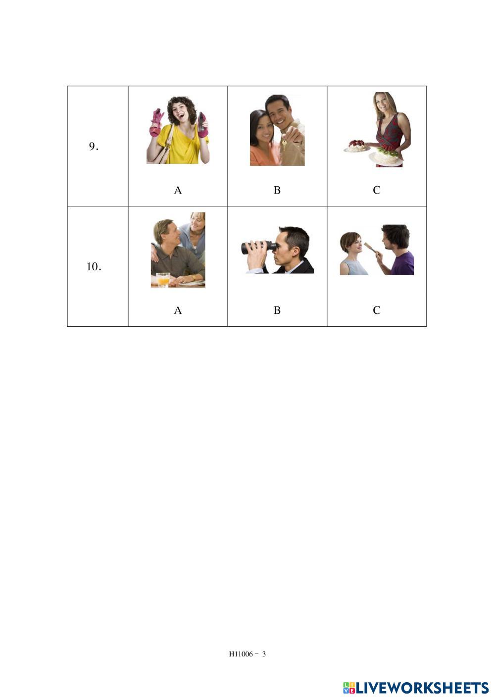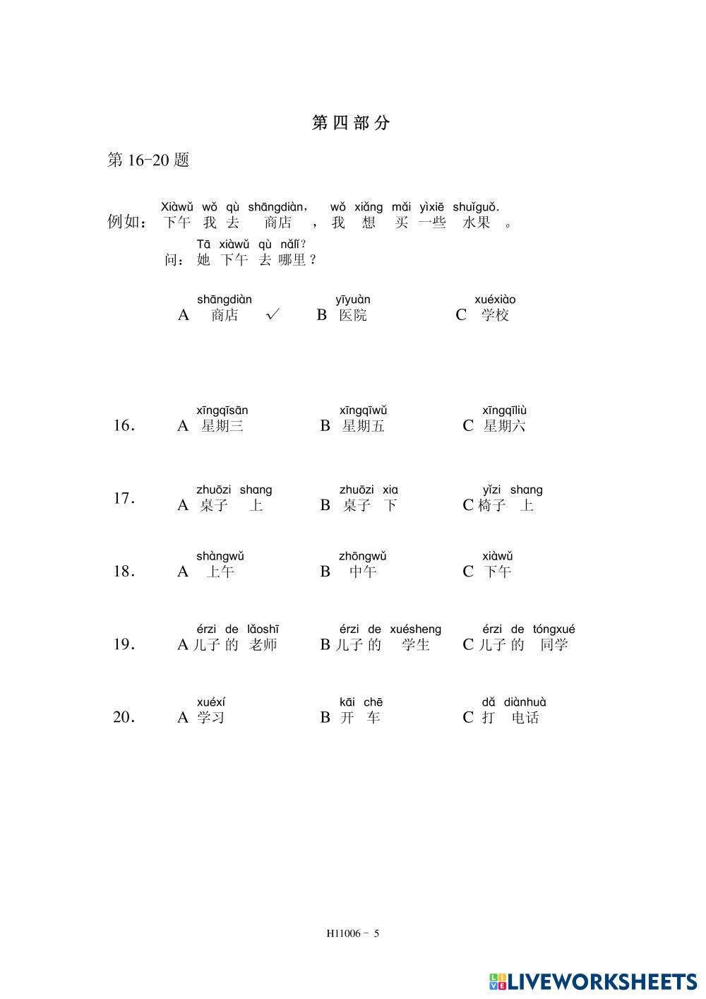 Created by Somnaliling HSK TEST HSK Test Age 3+ level: HSK1 Chinese Author's Instructions My Google Classroom Courses × 0 classes selected (0 students total) Quick Access Select all classes (0 classes) All Classes Loading courses... Cancel Share Share to selected Course __COURSE_NAME__ __STUDENT_NAME__ (__STUDENT_EMAIL__) HSK1-H11006 Download Worksheet Validation Check my answers Emails my answers to my teacher Full name Group/level School subject Teacher's email or key code Close Submit Validating worksheet... (12) Your answers have been sent to your teacher. Good luck! OK We encountered an error submitting your answers. Please try again. OK Advertisement | Go Ad Free Created by Somnaliling HSK TEST HSK Test Age 3+ level: HSK1 Chinese Author's Instructions