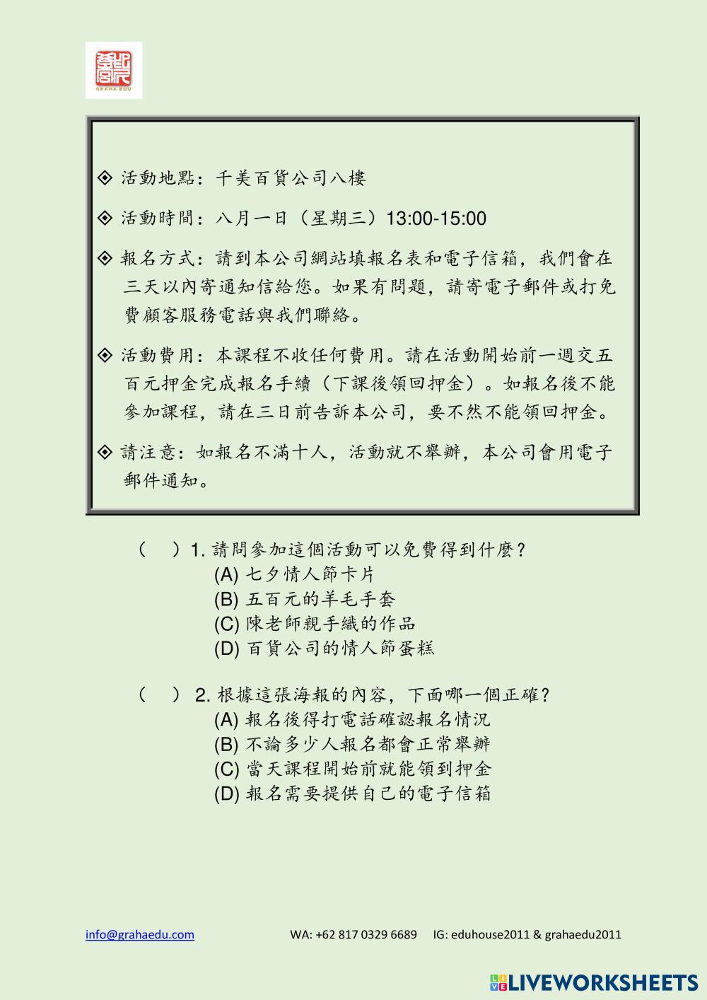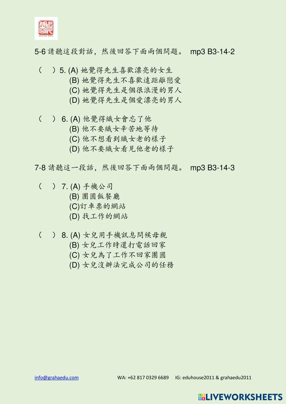 Created byGraha Edu Listening and reading comprehension TOCFL Age 10-16 level: Band B1 Chinese Author's Instructions My Google Classroom Courses × 0 classes selected (0 students total) Quick Access Select all classes (0 classes) All Classes Loading courses... Cancel Share Share to selected Course __COURSE_NAME__ __STUDENT_NAME__ (__STUDENT_EMAIL__) Modern 3 Unit 14 Download Worksheet Validation Check my answers Emails my answers to my teacher Full name Group/level School subject Teacher's email or key code Close Submit Validating worksheet... (12) Your answers have been sent to your teacher. Good luck! OK We encountered an error submitting your answers. Please try again. OK Advertisement | Go Ad Free Created byGraha Edu Listening and reading comprehension TOCFL Age 10-16 level: Band B1 Chinese Author's Instructions